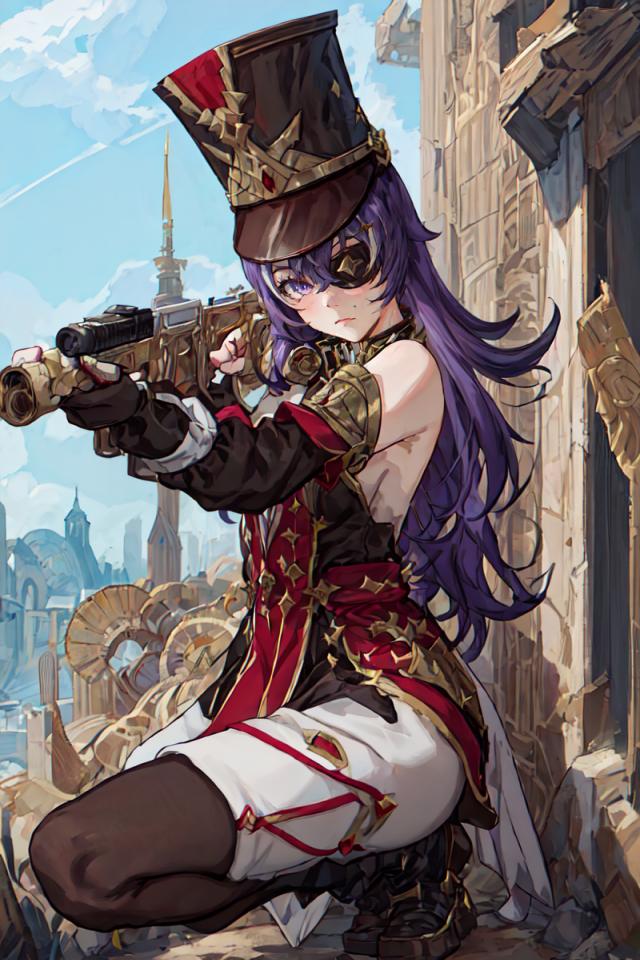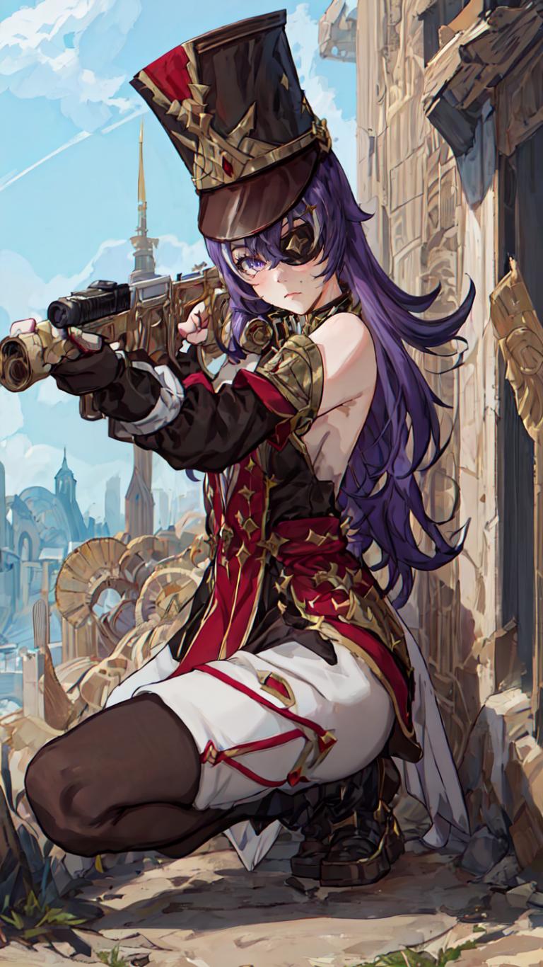 | Prompt | <lora:Chevreuse:0.9>chevreuse, bare_shoulders, gloves, pantyhose, long purple_hair, white_thighhighs, thigh_boots, shako_cap,solo, eyepatch,