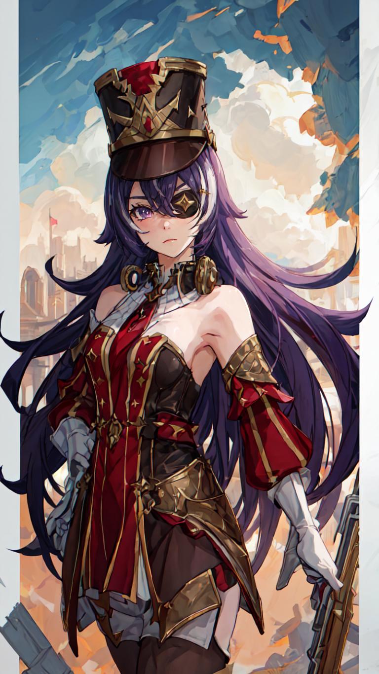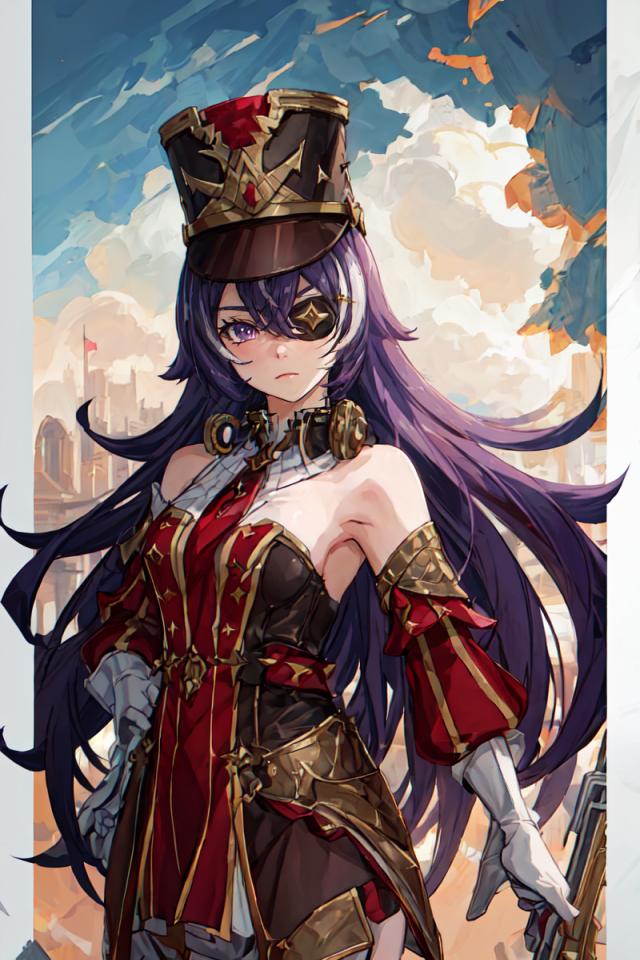 | Prompt | <lora:Chevreuse:0.9>chevreuse, bare_shoulders, gloves, pantyhose, long purple_hair, white_thighhighs, thigh_boots, shako_cap,solo, eyepatch,