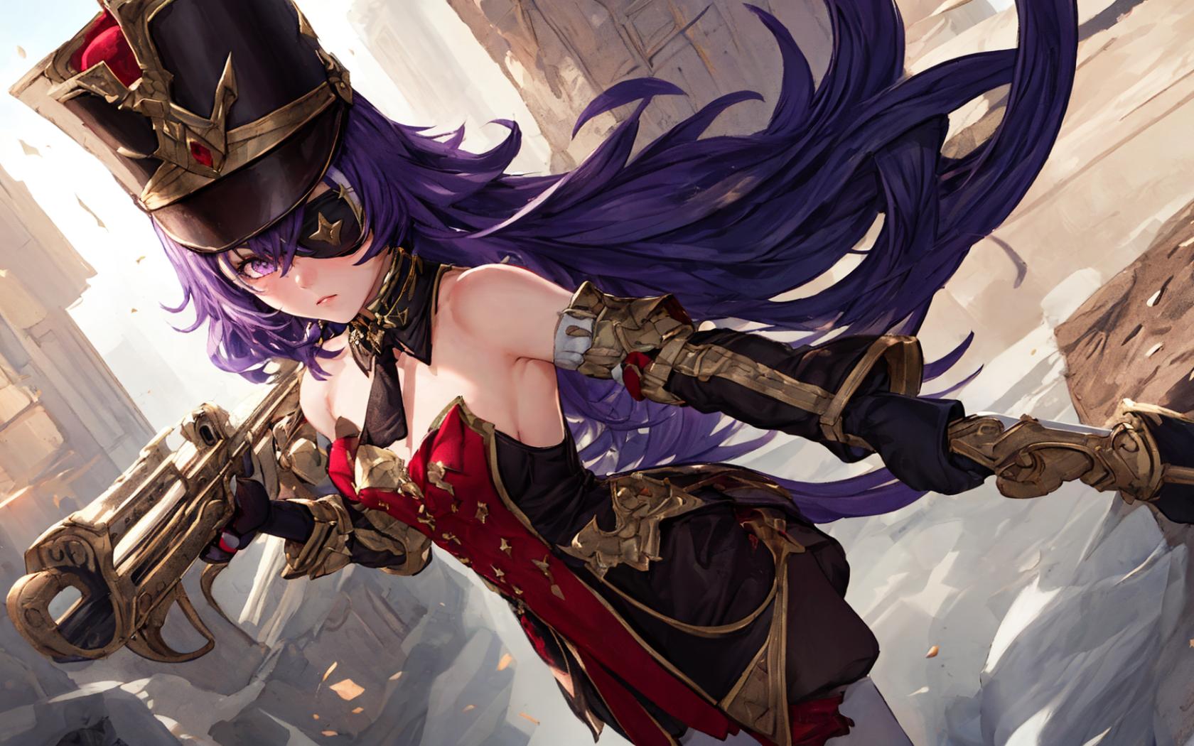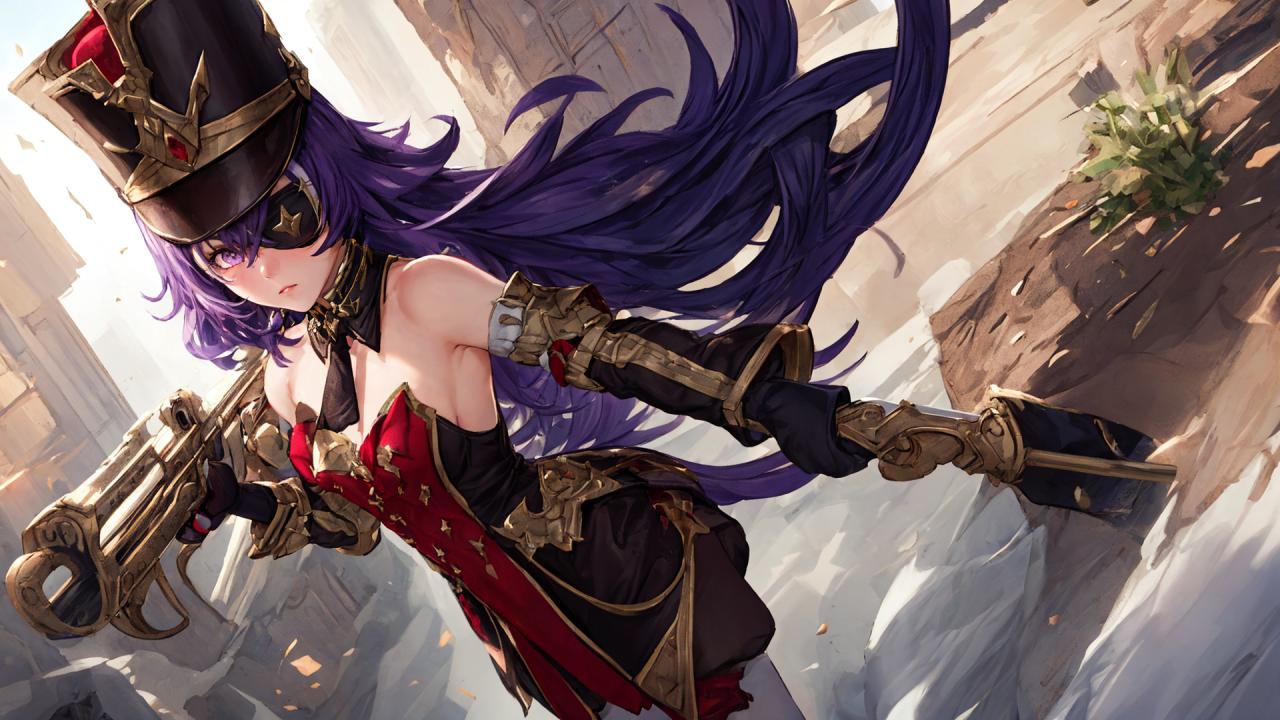 | Prompt | <lora:Chevreuse:0.8>chevreuse, bare_shoulders, eyepatch, gloves, pantyhose, purple_hair, white_thighhighs, thigh_boots, shako_cap,
