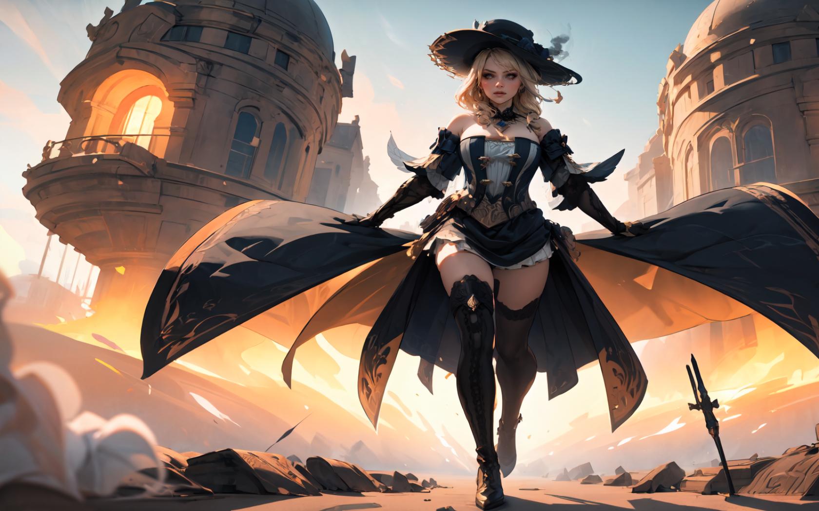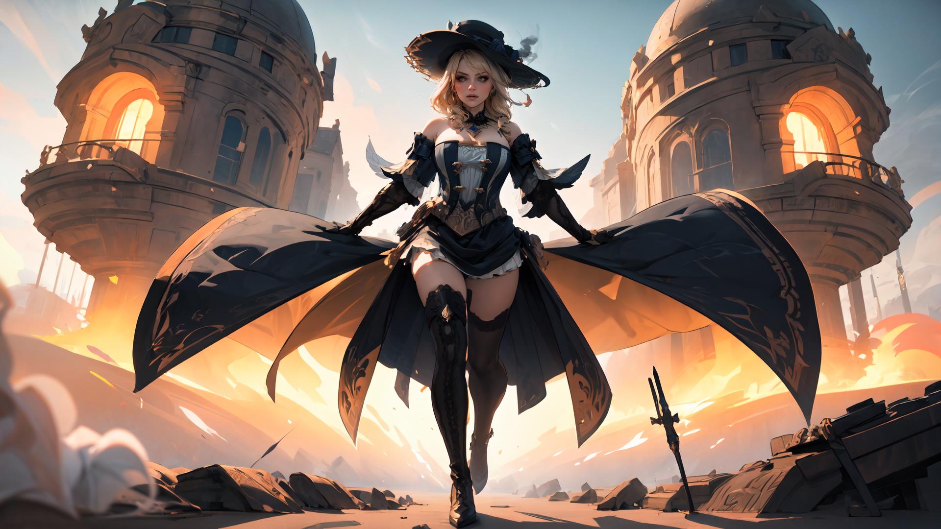 <lora:Char-Genshin-Navia-v2:0.9>navia \(genshin impact\),blonde hair,fancy hat, thigh boots, detached sleeves, single glove, strapless dress, detached collar, showgirl skirt, necklace, waist cape,