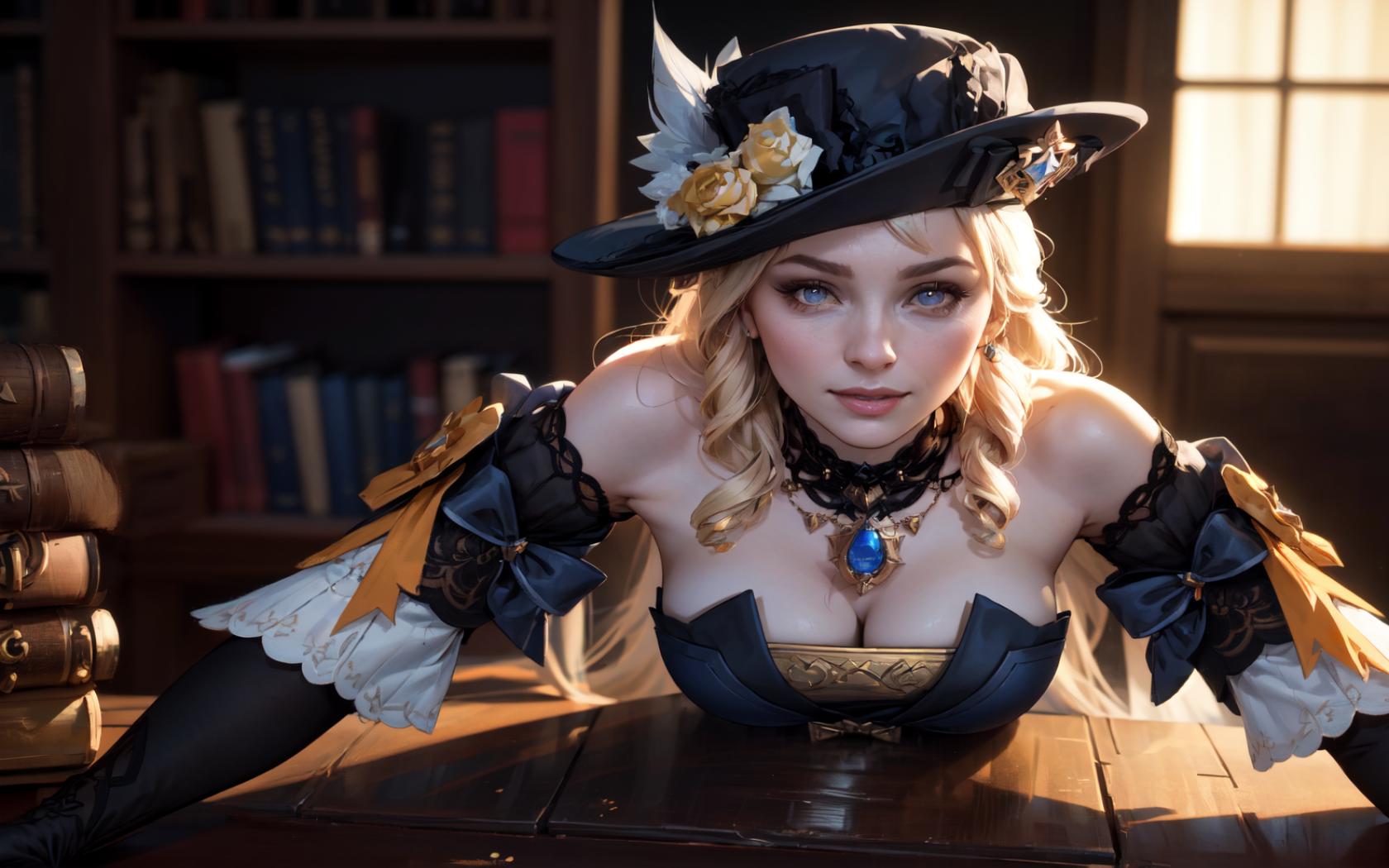 1girl, bare shoulders, black gloves, black headwear, blonde hair, blue eyes, blurry, blurry background, book, book stack , bookshelf, bow, brooch, cleavage, closed mouth, corset, curly hair, depth of field, detached collar, detached sleeves, dress, eyelashes, flower, gloves, hat, hat feather, hat flower, indoors, jewelry, lace trim, large breasts, leaning forward, long hair, looking at viewer, medium breasts, necklace, pendant, rose, solo, strapless, sunlight, upper body, window