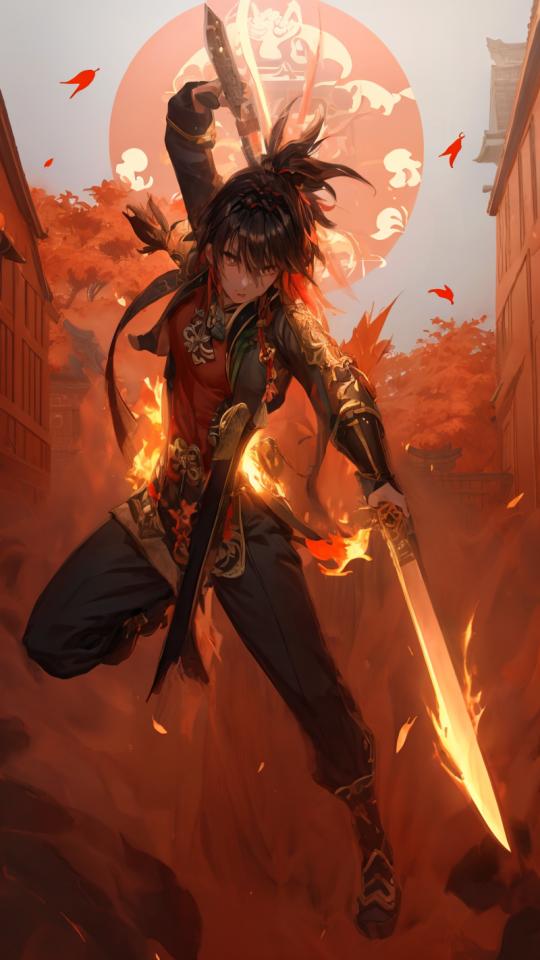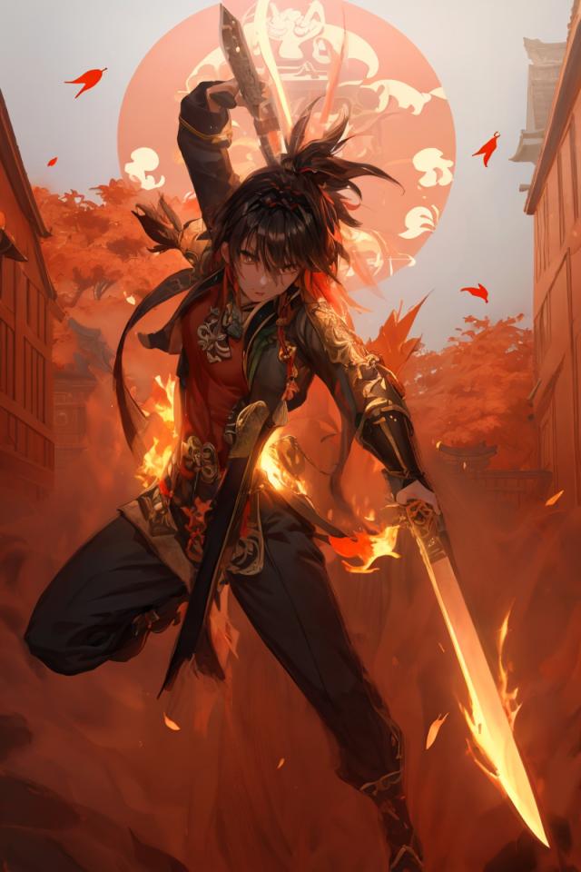 1boy, architecture, arm up, autumn leaves, bangs, black hair, black pants, boots, building, chinese clothes, dual wielding, east asian architecture , full body, hair between eyes, holding, holding sword, holding weapon, leaf, long hair, long sleeves, looking at viewer, male focus, maple leaf, outdoors, pants, ponytail, solo, standing, sword, tree, weapon