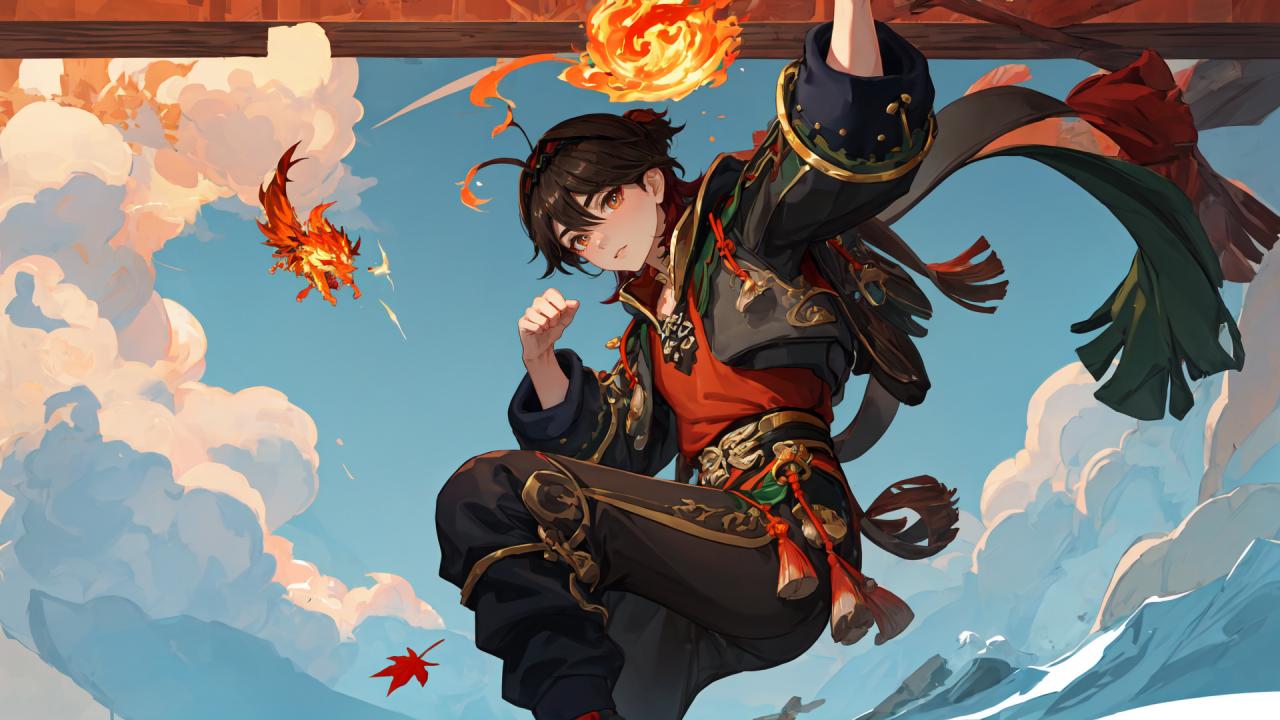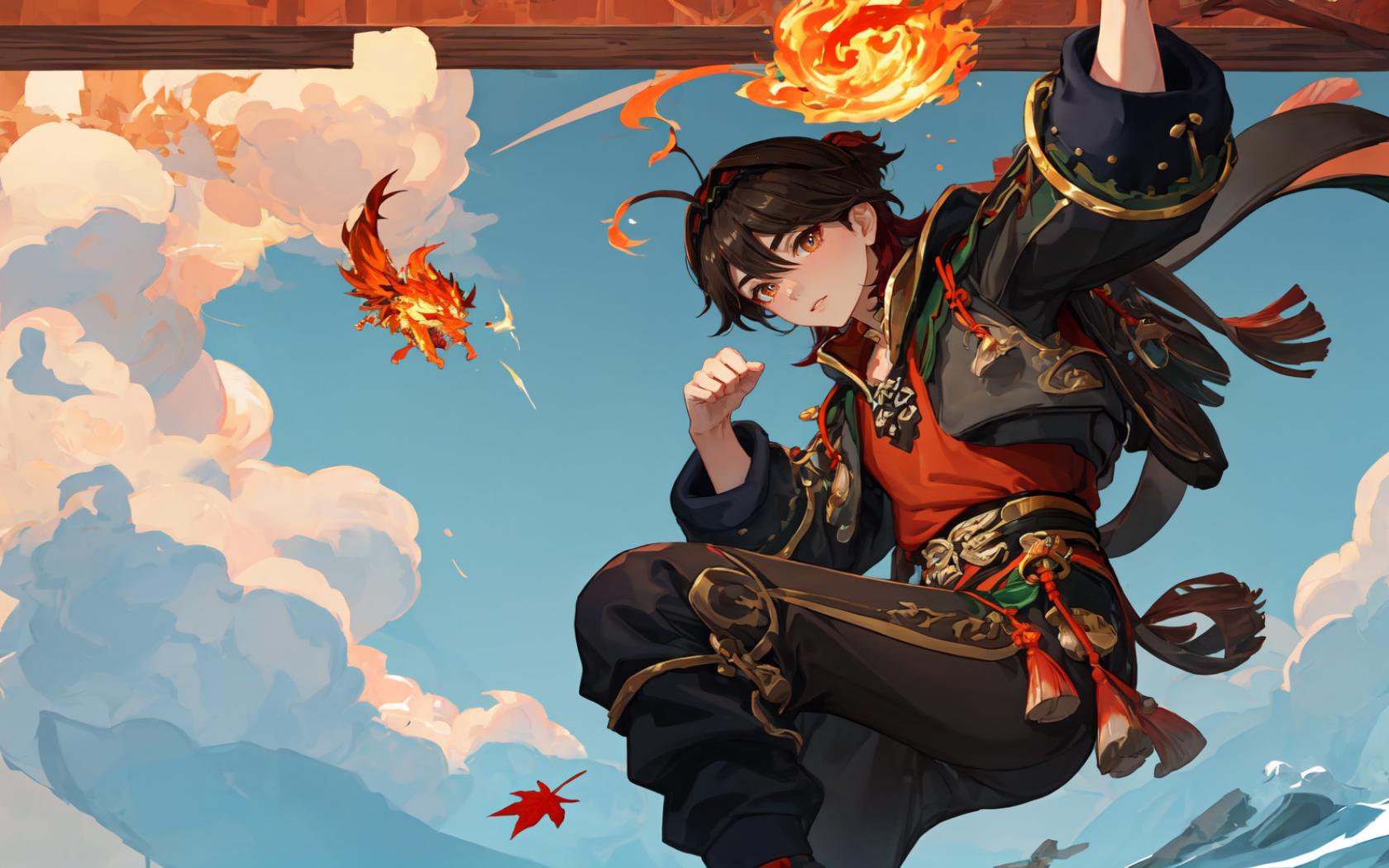BREAK (fantasy chinese flaming fire dragon made of flames at background), BREAK (epic fantasy:1.4, anime art:1.3,promotional,official art, movie still), (depth of field), ,best quality,dynamic pose,sharp focus,(8k), (4k),(Masterpiece), (Best Quality), fantasy, extremely detailed, intricate, hyper detailed, (perfect face), illustration, ray tracing, light particles, <lora:more_details:0.3> |