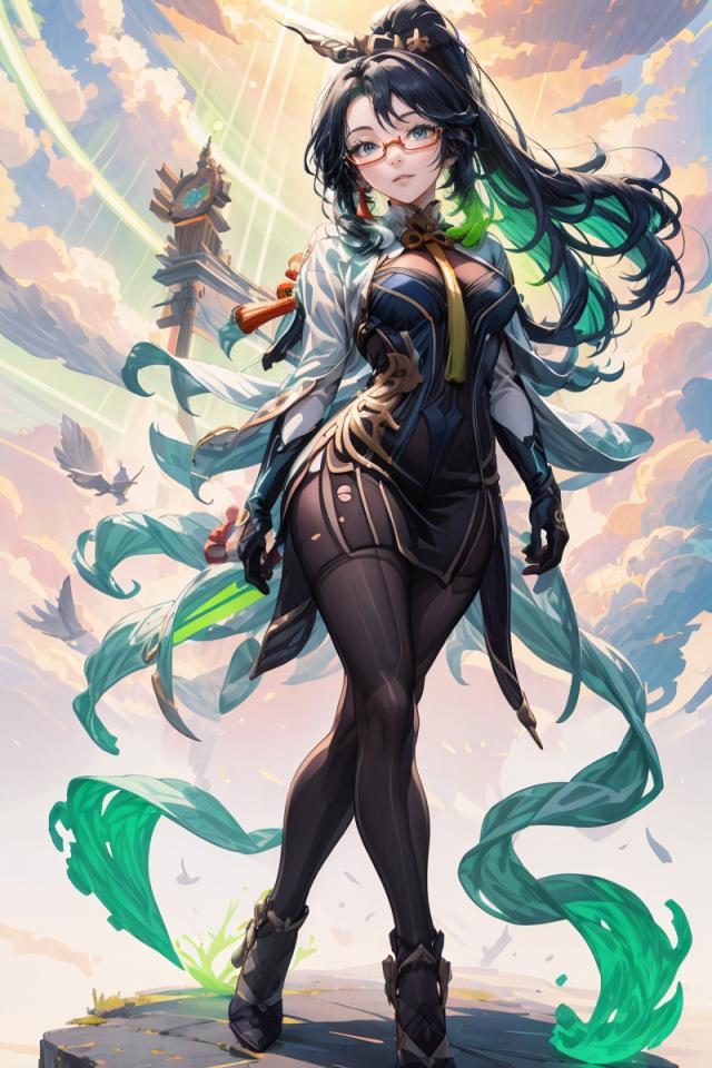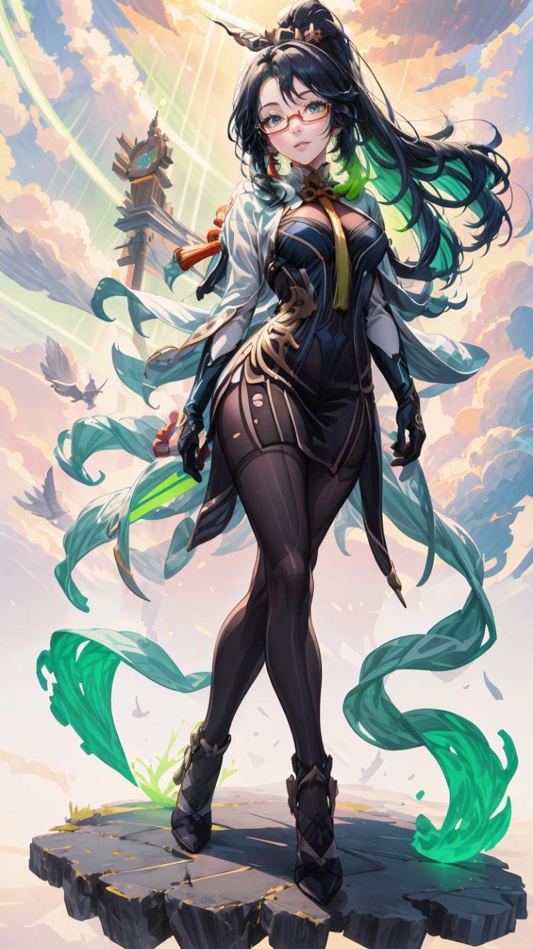 <lora:Xianyun:0.8>long hair, blue eyes, glasses, semi-rimless eyewear, ponytail, multicolored hair, hair ornament, earrings, chinese clothes, bodysuit, elbow gloves, dress,
