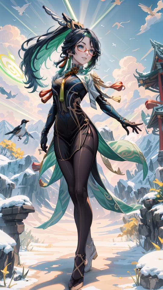 1girl, bangs, bird, black dress, black gloves, black hair, blue eyes, cloud, dress, earrings, elbow gloves, full body, glasses, gloves, gold trim, green hair, hair ornament, jewelry, long hair, medium breasts, mole, mountain, multicolored hair, outdoors, pantyhose, parted lips, pelvic curtain, ponytail, semi-rimless eyewear, sky, smile, solo, standing, tassel, tassel earrings