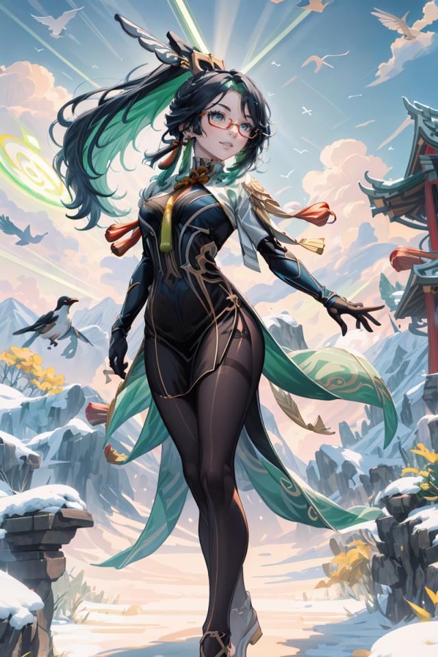 <lora:Xianyun:0.8>long hair, blue eyes, glasses, semi-rimless eyewear, ponytail, multicolored hair, hair ornament, earrings, chinese clothes, bodysuit, elbow gloves, dress,pantyhose,