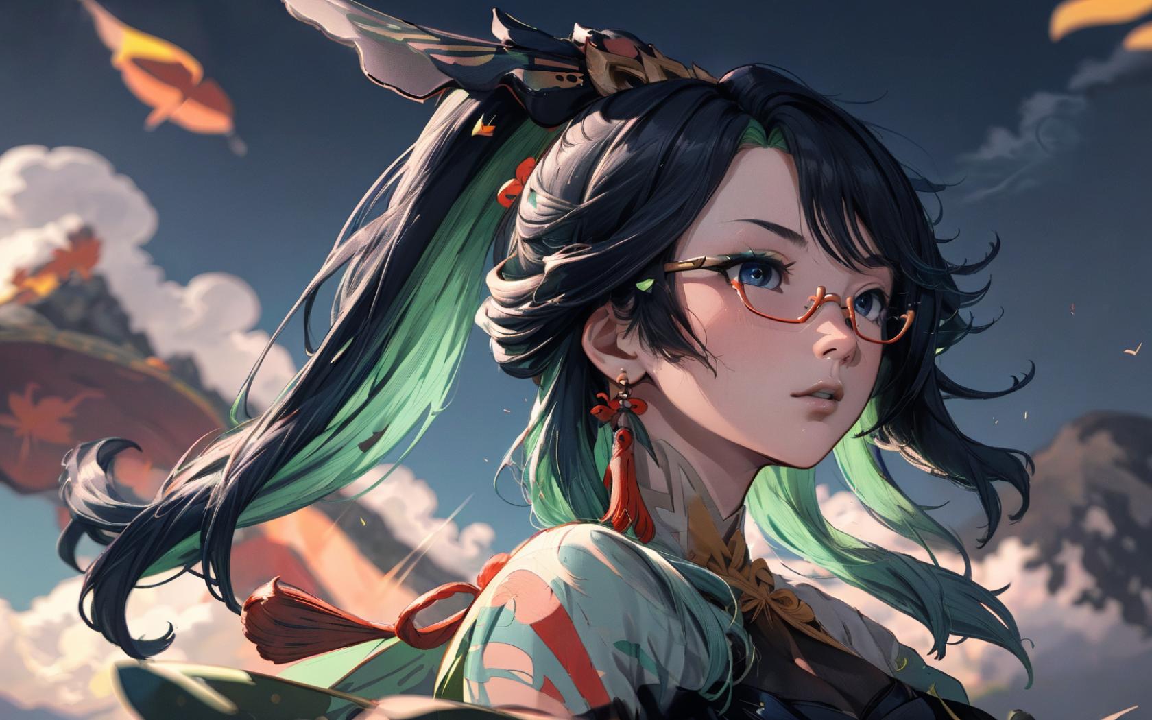 | Prompt | <lora:Xianyun:1> long hair, blue eyes, glasses, semi-rimless eyewear, ponytail, multicolored hair, hair ornament, earrings, chinese clothes, bodysuit, elbow gloves, dress,