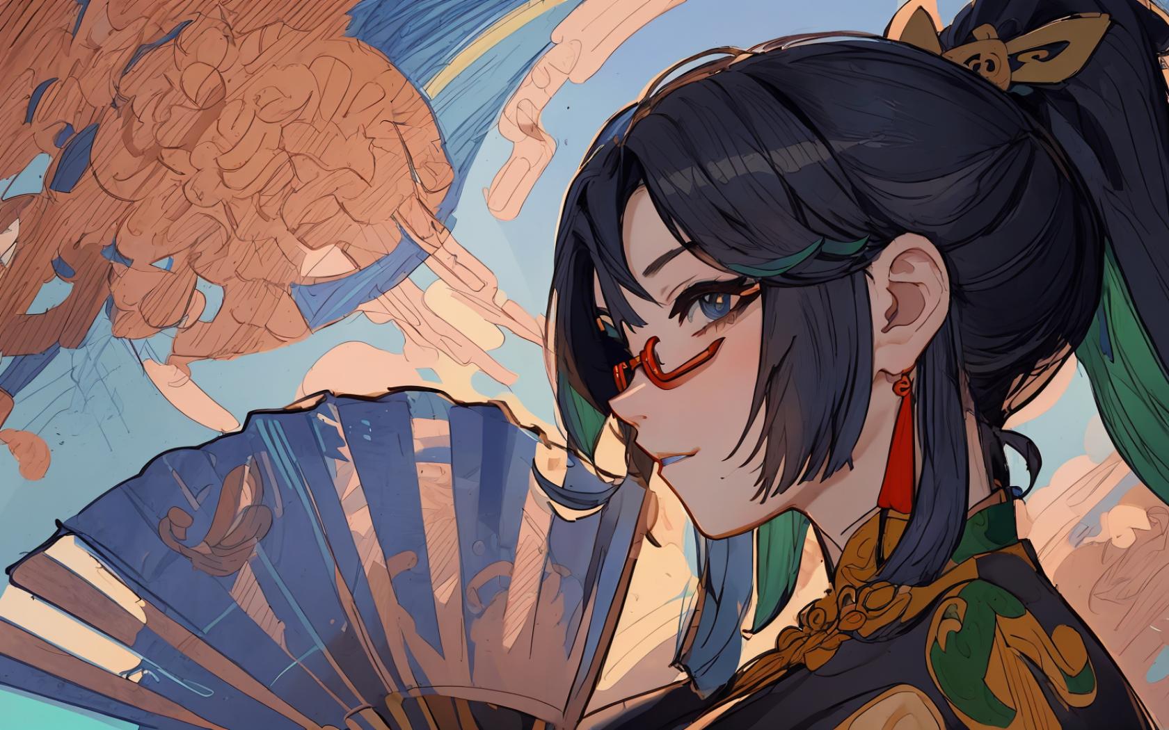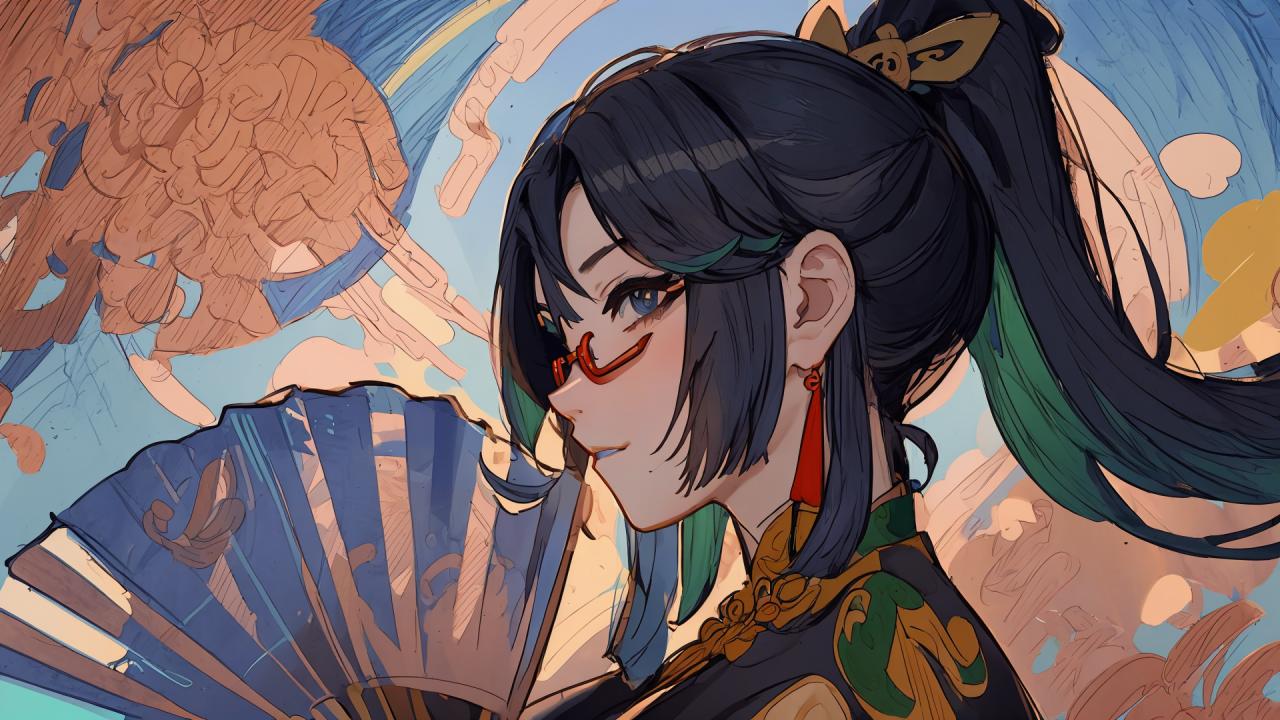 1girl, bangs, black hair, blue eyes, chinese clothes, earrings, from side, glasses, green hair, hair ornament, hand fan, holding, holding fan , jewelry, long hair, looking at viewer, mole, mole under mouth, multicolored hair, parted lips, ponytail, red-framed eyewear, semi-rimless eyewear, solo, under-rim eyewear