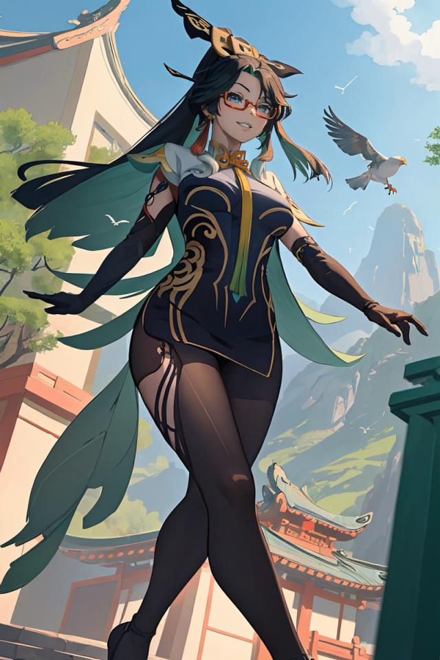 | Prompt | <lora:xianyun_v2:0.8>xianyun, very long hair, ponytail, hair ornament, semi-rimless eyewear, earrings,black bodysuit, elbow gloves, high heels,