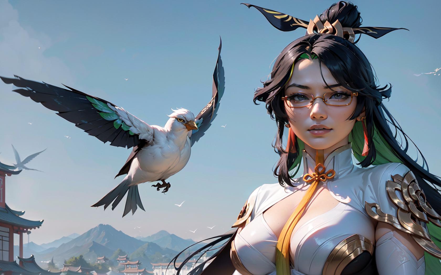 ((scenery, sky, east asian architecture, adjusting eyewear))