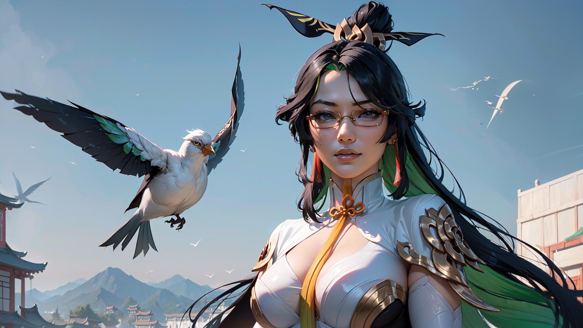 | Prompt | <lora:xianyun_v2:0.8>xianyun, very long hair, ponytail, hair ornament, semi-rimless eyewear, earrings,black bodysuit, elbow gloves, high heels,