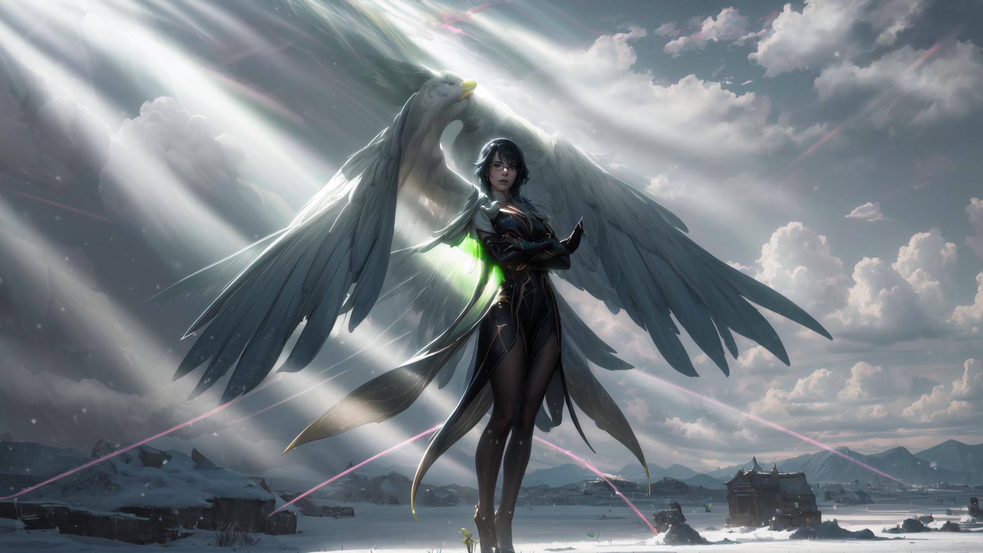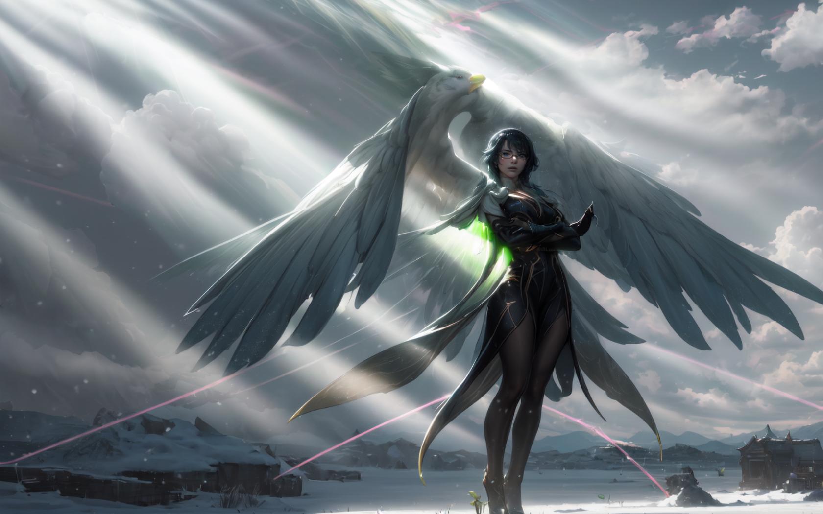 BREAK (((giant huge bird at background in the clouds behind with spread white wings wide open))), (wings, white feathered wings), BREAK (sunrays through white clouds:1.9), BREAK (detailed,realistic:1.7),(realistic anime,promotional, official art:1.4), photorealistic, octane render,(hyperrealistic:1.2),(photorealistic face:1.2),(1girl:1.4),(skindentation:1.3), best quality,dynamic pose,sharp focus,(8k), (4k),(Masterpiece), (Best Quality), fantasy, extremely detailed, intricate, hyper detailed, (perfect face), <lora:more_details:0.3> <lora:neg4all_bdsqlsz_V3.5:0.8>(masterpiece,best quality,ultra_detailed,highres,absurdres:1.2), |