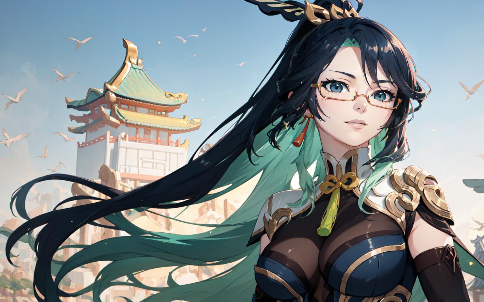 ((scenery, sky, east asian architecture, adjusting eyewear))