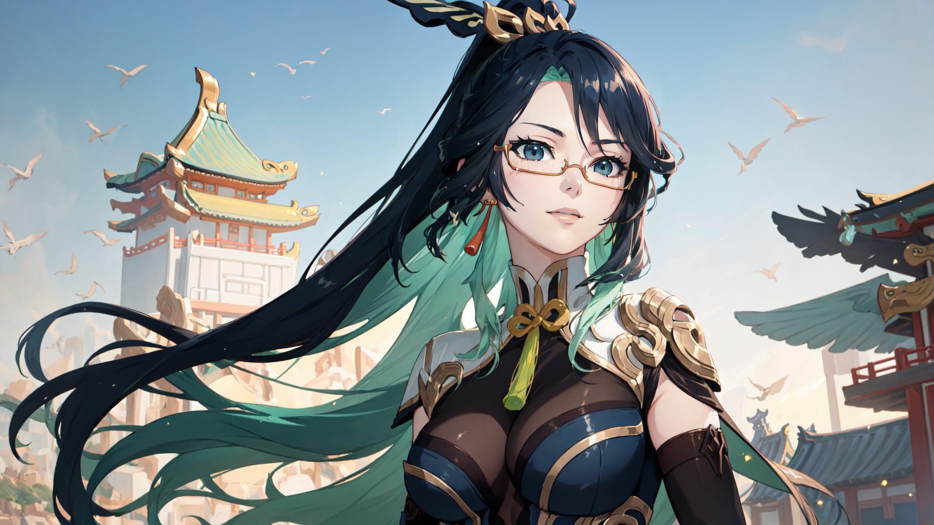 | Prompt | <lora:xianyun_v2:0.8>xianyun, very long hair, ponytail, hair ornament, semi-rimless eyewear, earrings,black bodysuit, elbow gloves, high heels,