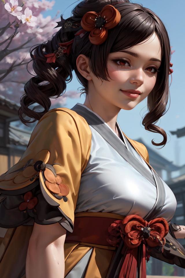| Prompt | <lora:chiori:1>chiori, 1girl, brown hair, drill hair, hair ornament,hair flower, flower, red eyes, elbow gloves,short sleeves,wide sleeves, japanese clothes, kimono, pleated skirt,dress, black thighhighs,