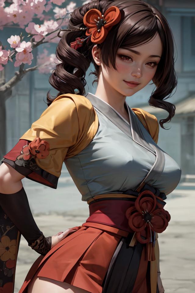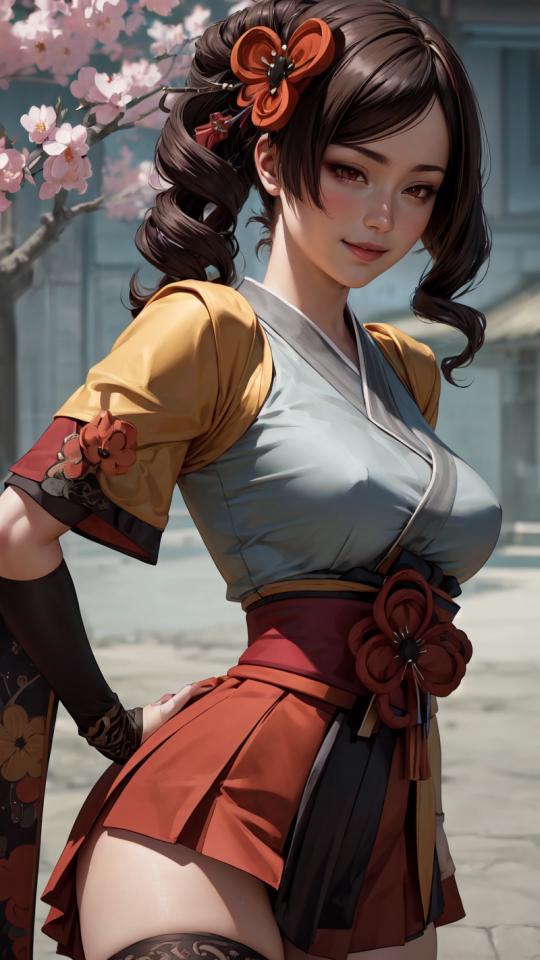 | Prompt | <lora:chiori:1>chiori, 1girl, brown hair, drill hair, hair ornament,hair flower, flower, red eyes, elbow gloves,short sleeves,wide sleeves, japanese clothes, kimono, pleated skirt,dress, black thighhighs,