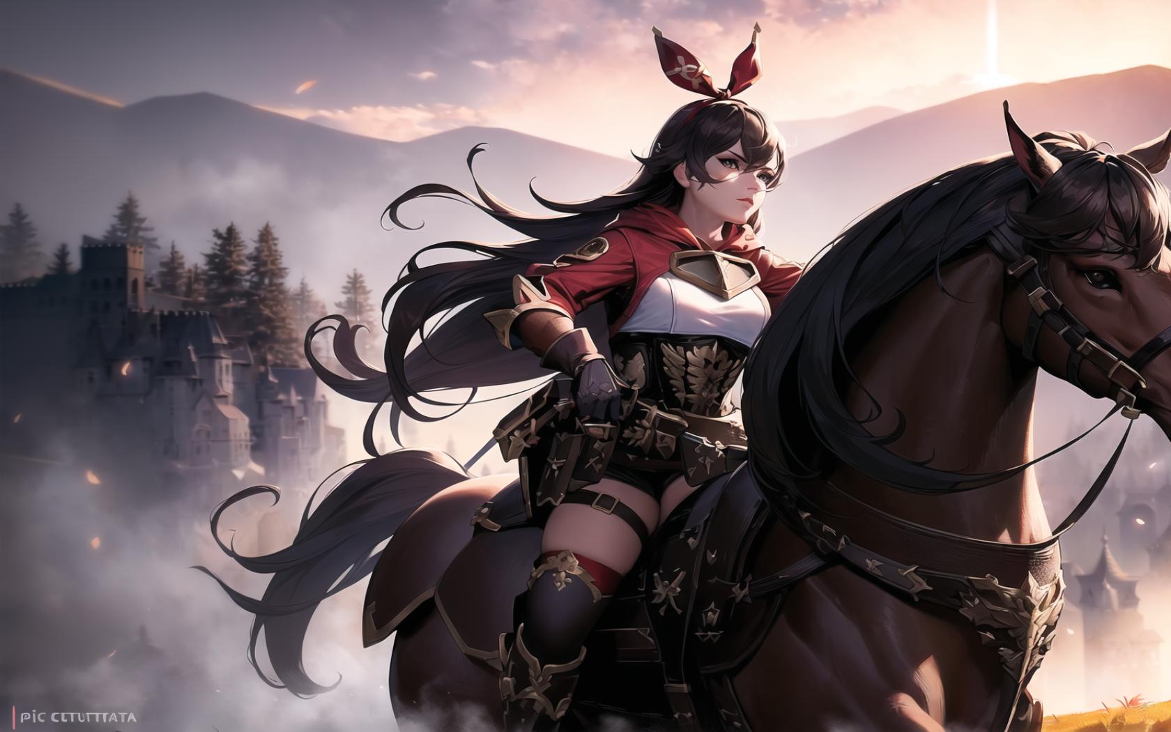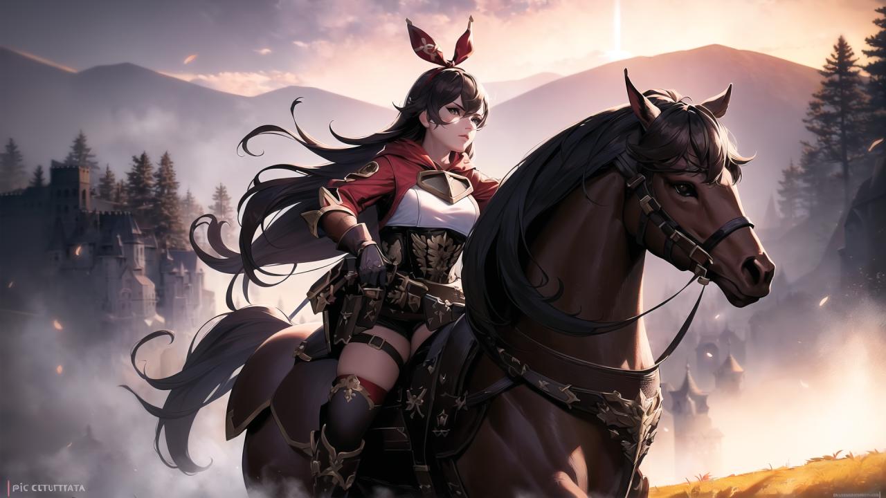 Prompt (detailed:1.5), (epic, heroic:1.5),(style of Greg Rutkowski:1.5), (perfect artwork), best quality,sharp focus,(8k), (4k),(Masterpiece), (Best Quality), fantasy, extremely detailed, intricate, hyper detailed, (perfect face), illustration,soft lighting, Ultra detailed fantasy environment, clearly worked out detail, intricate, cinematic,(depth of field), (moody lighting:1.2), photorealistic, octane render,(hyperrealistic:1.2),(photorealistic face:1.2),(1girl:1.4),(skindentation:1.3), <lora:amber1:1>amber5star, (1girl, solo),long brown hair,headband, outdoors, sunrise, autumn, trees,wind, ( forest), ((mist)), (front of a medieval castle), (riding armored galloping horse:1.3), ((dynamic, speed, speed effect:1.4)), (hands on horse), serious, focused,angry, (looking at viewer:1.3), (cowboy shot),