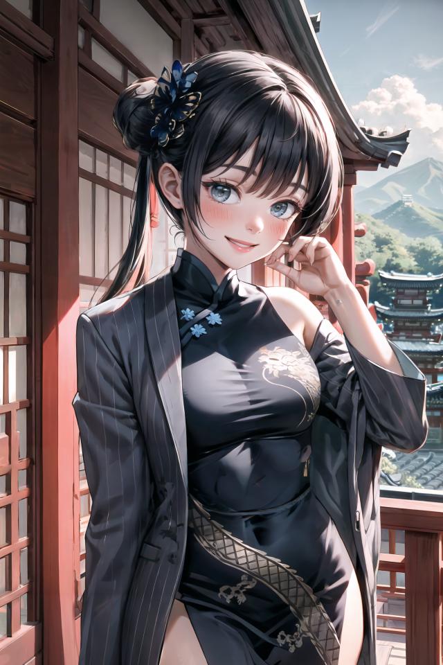 1girl, :d, architecture, bangs, bare shoulders, black dress, black hair, black jacket, blue eyes, blush, china dress, chinese clothes, covered navel, cowboy shot, day, dress, east asian architecture, grey eyes, hair bun, hair ornament, hand up, jacket, long hair, long sleeves, looking at viewer, medium breasts, off shoulder, open clothes, open jacket, open mouth, outdoors, side slit, single hair bun, sleeveless, sleeveless dress, smile, solo, standing, taut clothes, taut dress , twintails