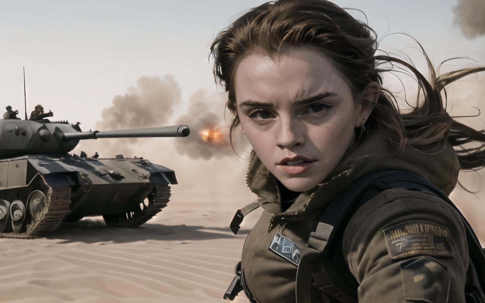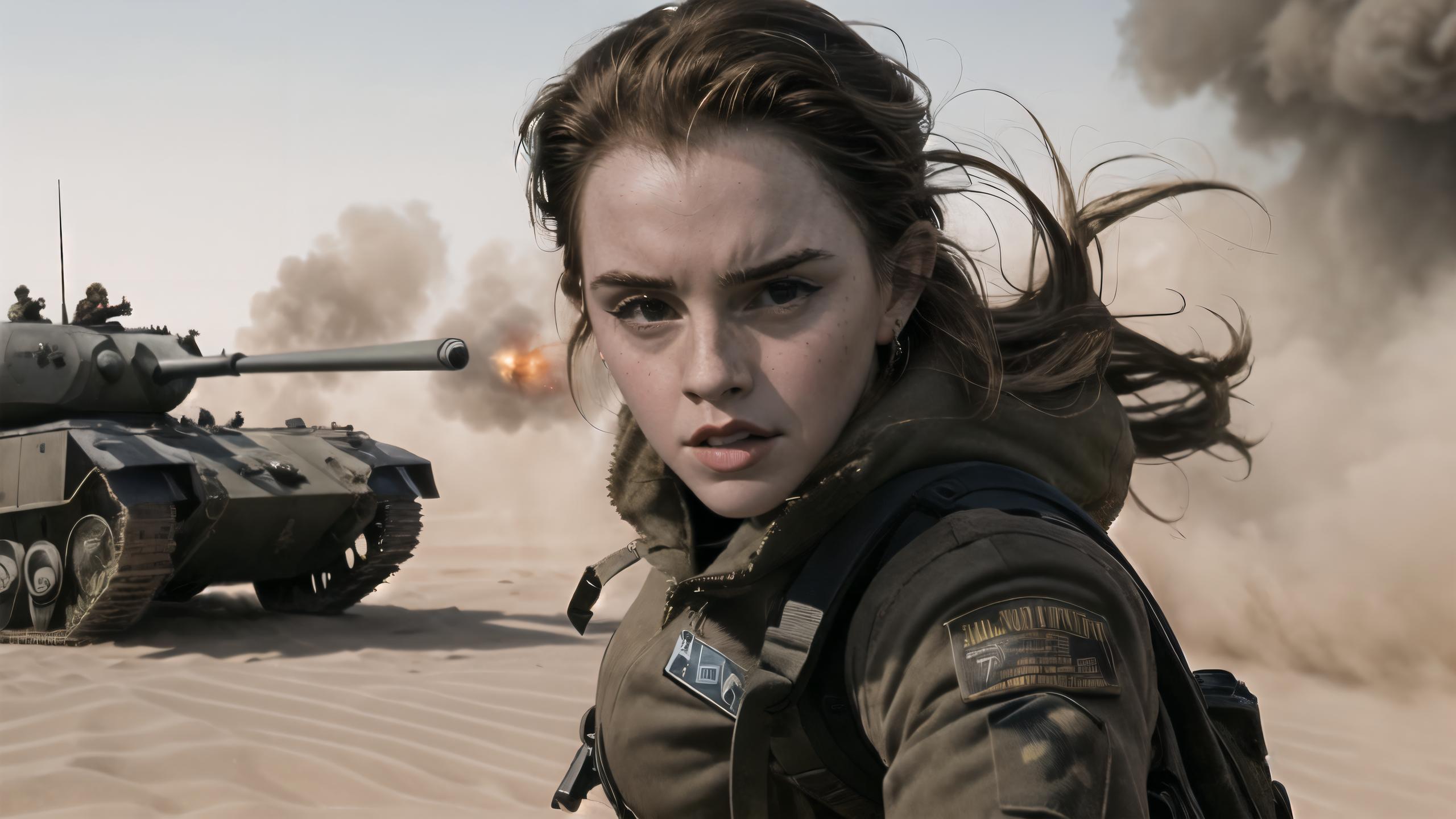Prompt <lora:EmmaWatson2017LoRaDogu:1>((ewt,ewt woman,solo)), war scene, explosions, tank,smoke,battlefield, dynamic pose, action pose,dog tags, war planes flying above her head, blurry background, agressive,deep intensive murderous glance, sand,ruins,