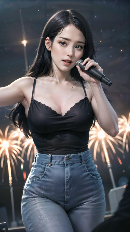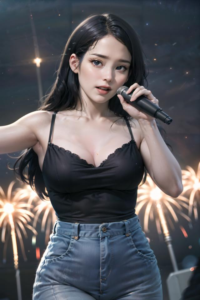 Prompt <lora:iu_v35:1> iu1,facing viewer, singing,happy,dynamic pose, performing in a korean outdoors theater, looking at viewer, motion blur, depth of field, holding mic, pyrotechnic effects, light projectors,fireworks,((dutch angle)), starry sky, nebula,