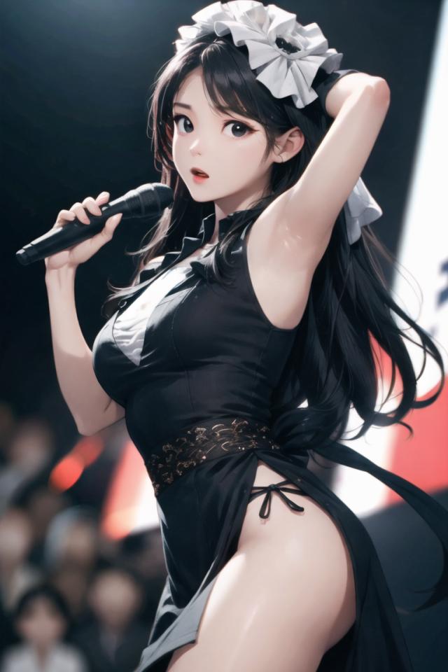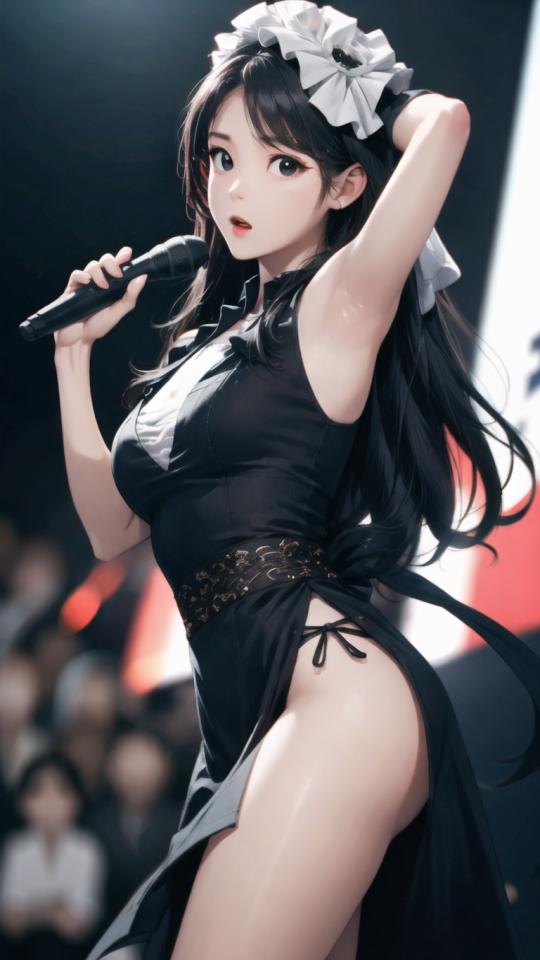 Prompt <lora:iu_v35:1> iu1,((solo)), singing, performing in a korean theater, looking at viewer,dynamic pose, motion blur, depth of field, korean banners,