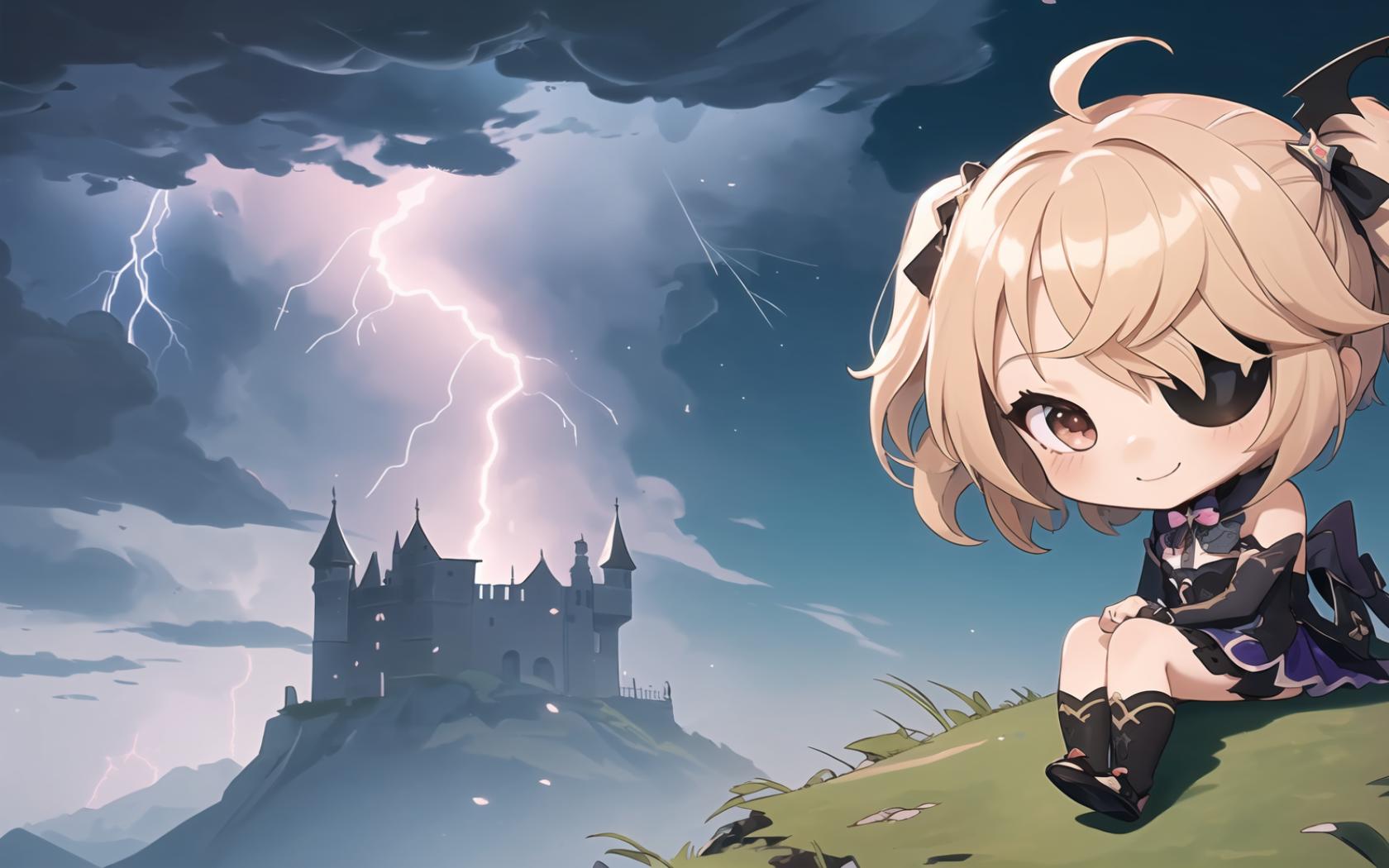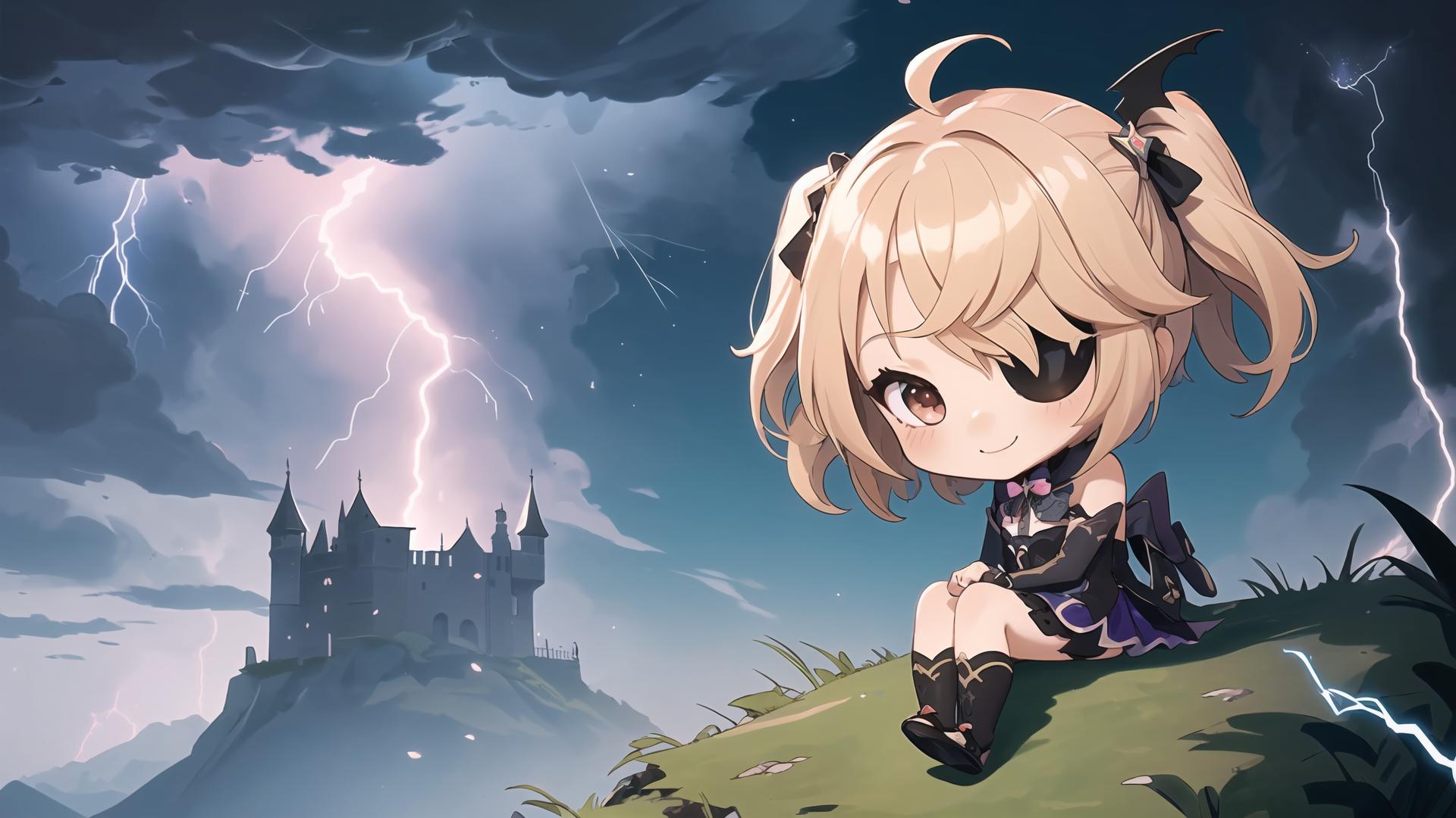 1girl, ahoge, bangs, bare shoulders, black dress, black footwear, black sleeves, blonde hair, blush, boots, bow, bridal gauntlets, brown eyes, chibi, closed mouth, cloud, cloudy sky, detached sleeves, dress, electricity, eyepatch, lightning, lightning bolt symbol, long sleeves, looking at viewer, night, outdoors, sitting, sky, smile, socks, solo, two side up, wing hair ornament
