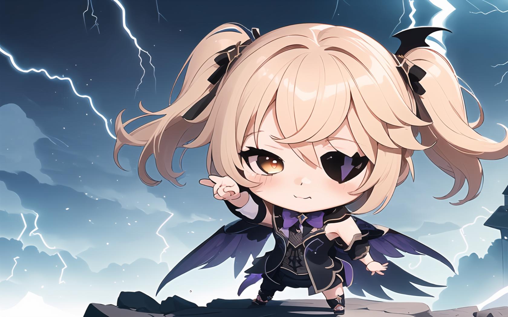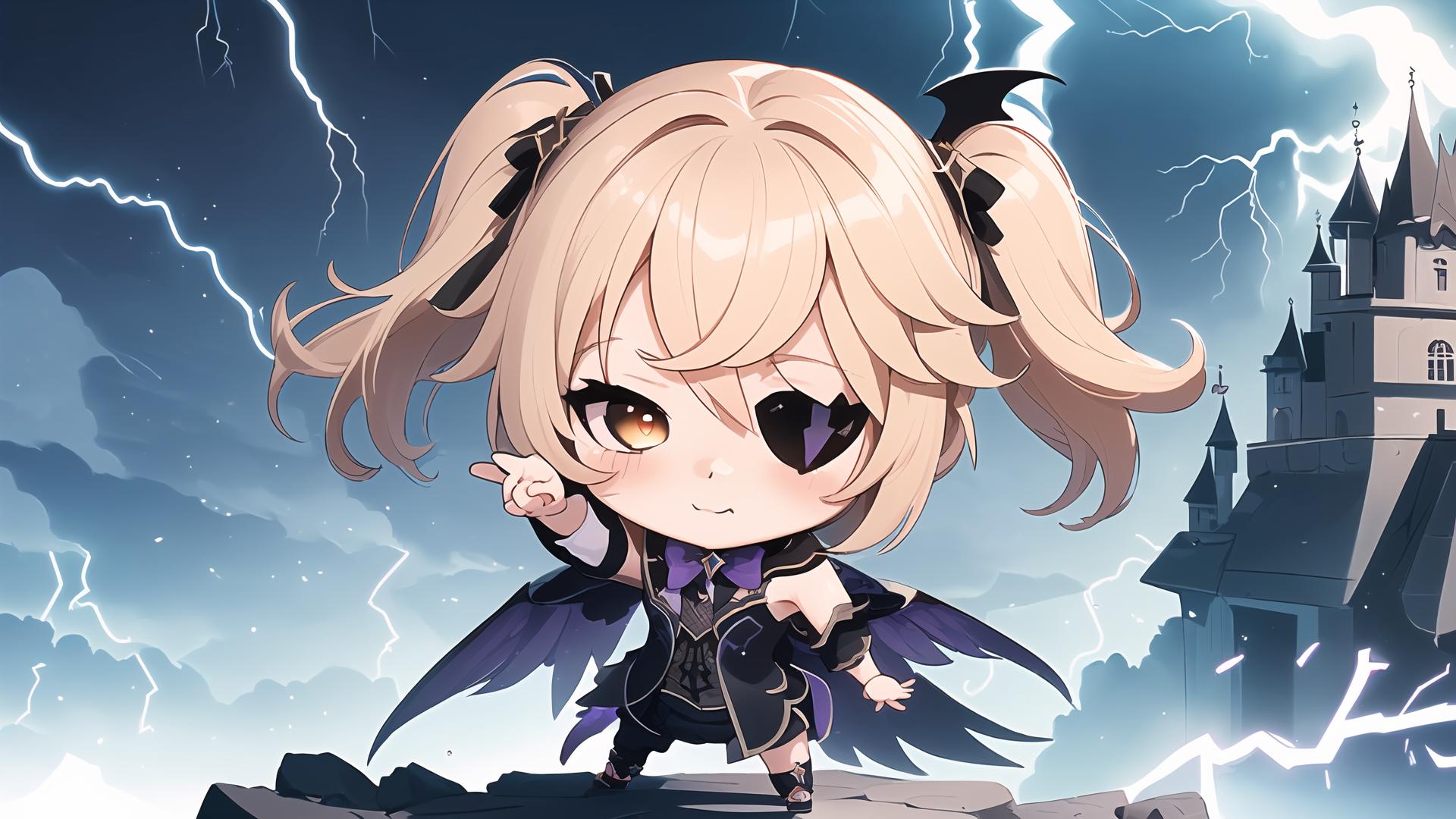 1girl, bangs, black dress, black footwear, black wings, blonde hair, blush, bow, brown eyes, castle, chibi, closed mouth, cloud, cloudy sky, detached sleeves, dress, electricity, eyepatch, fishnets, full body, hair between eyes, hair ornament, lightning, long hair, long sleeves, looking at viewer, pantyhose, puffy sleeves, purple bow, purple bowtie, single leg pantyhose , single thighhigh, sky, smile, solo, standing, thighhighs, twintails, two side up, v, wings