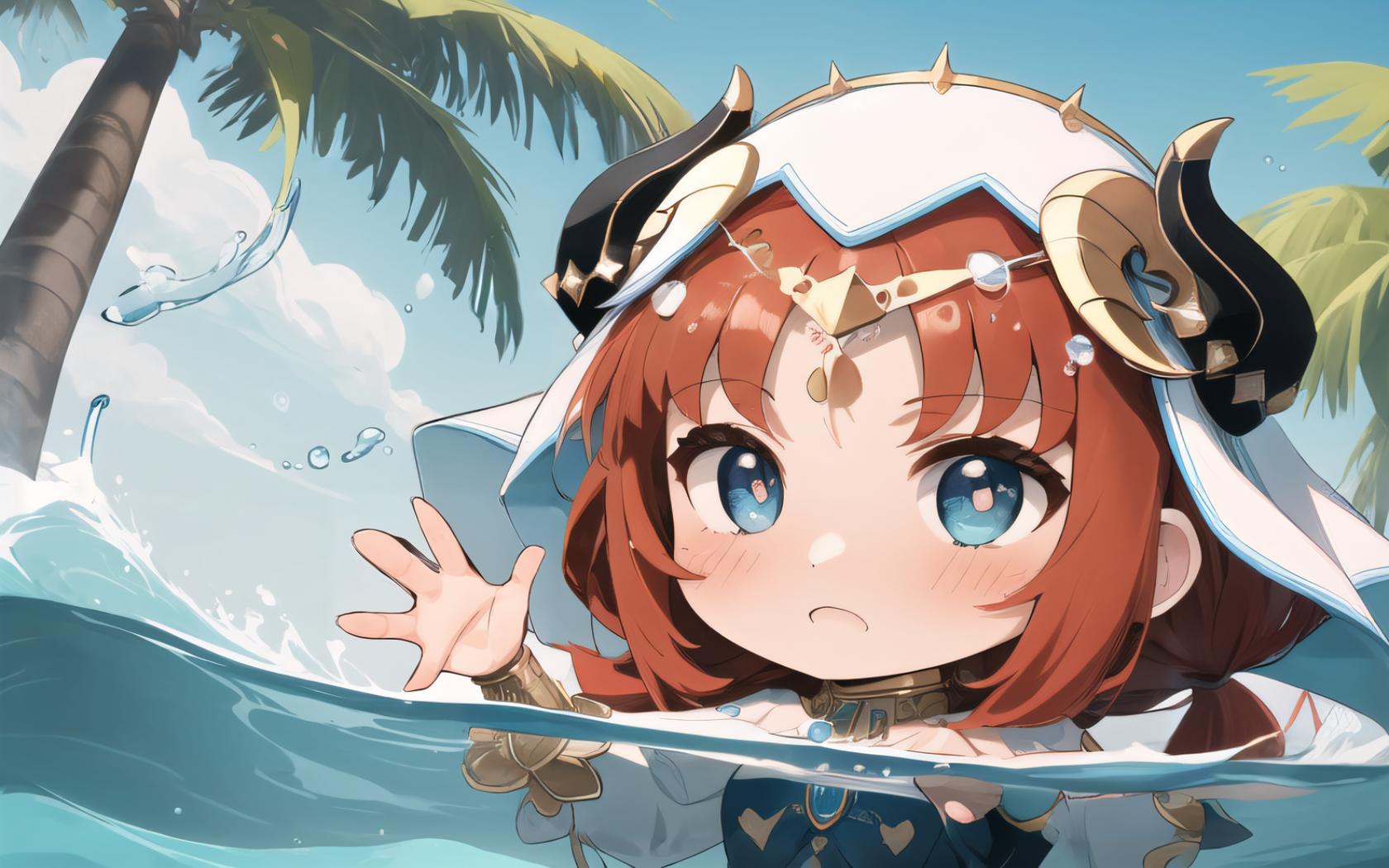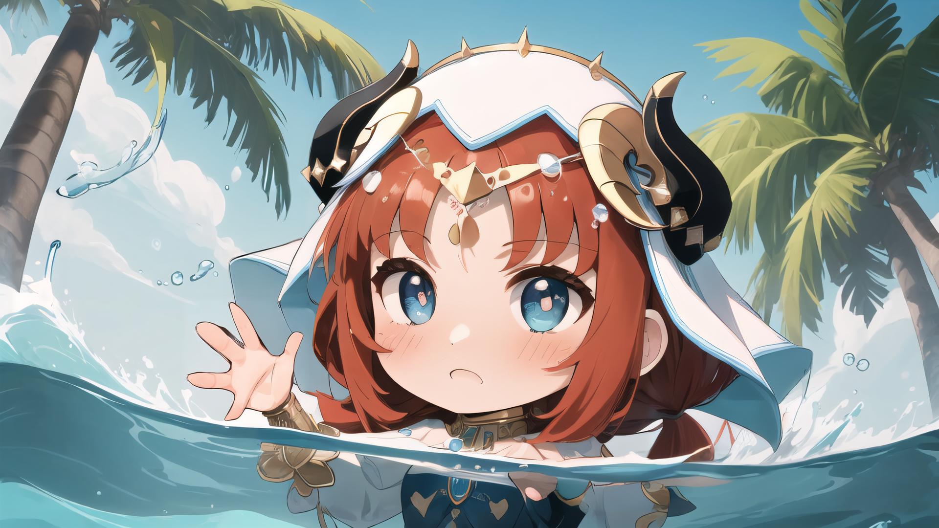 1girl, bangs, bare shoulders, blue eyes, blue sky, blush, chibi, day, detached sleeves, fake horns, harem outfit, horns, jewelry, long hair, long sleeves, looking at viewer, low twintails, neck ring, open mouth, outdoors, palm tree, parted bangs, partially submerged, partially underwater shot , puffy long sleeves, puffy sleeves, red hair, sky, solo, tree, twintails, upper body, veil, water