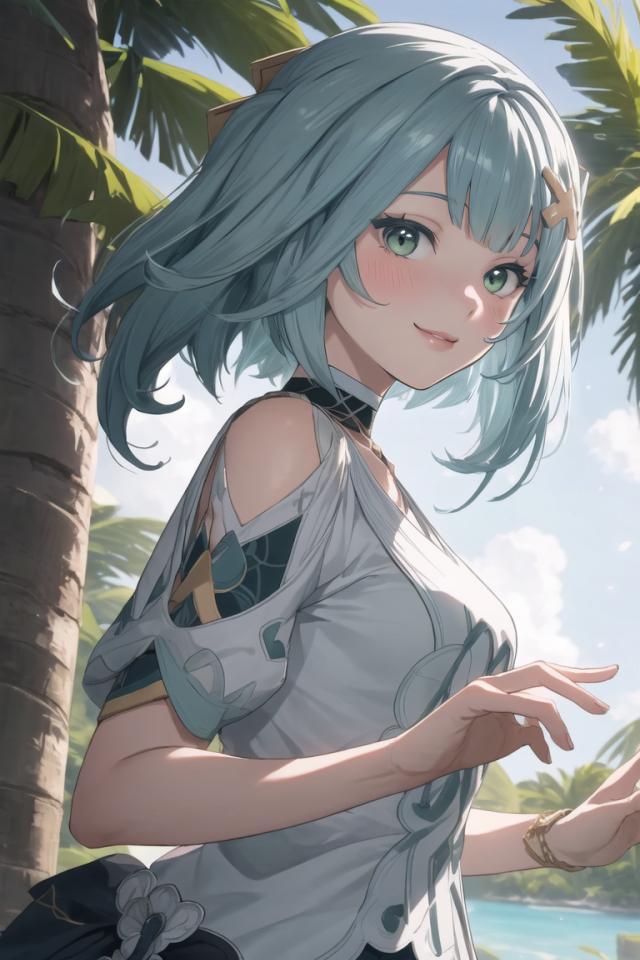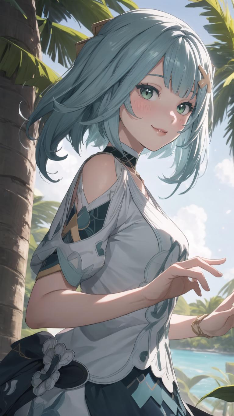 1girl, aqua hair, bangs, bare shoulders, blue sky, blush, bracelet, choker, clothing cutout, cloud, day, dress, from side, green eyes, hair ornament, jewelry, looking at viewer, outdoors, palm tree, parted lips, shirt, short hair, short sleeves, shoulder cutout , sky, smile, solo, tree, white dress, white shirt