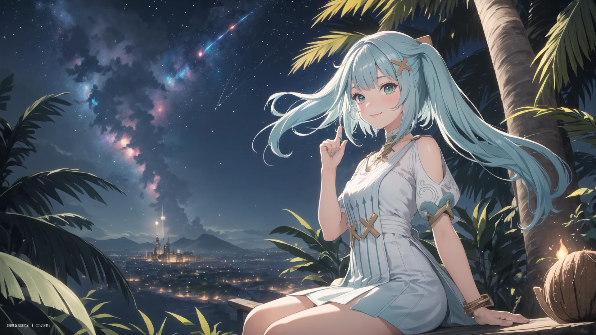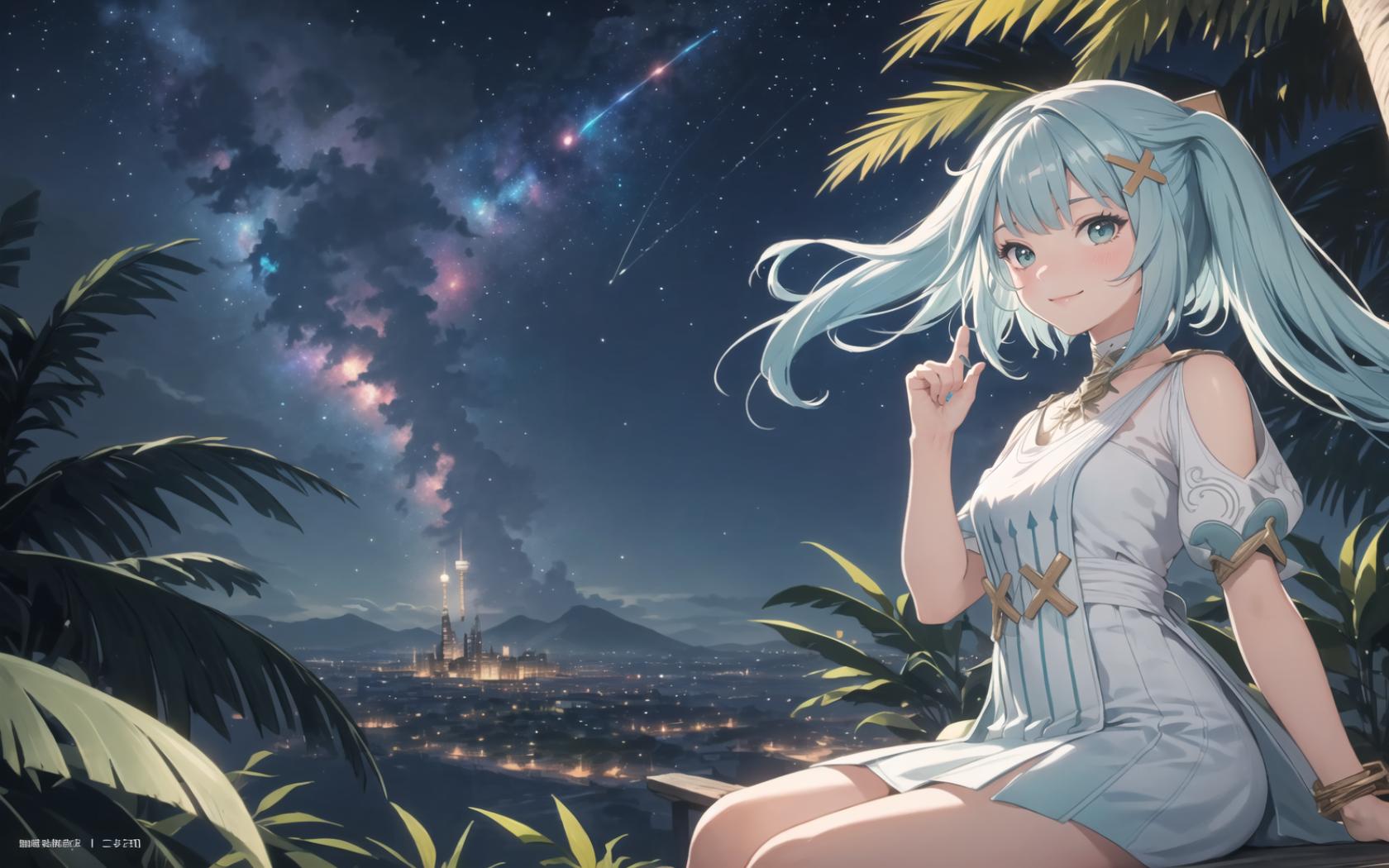 1girl, aqua eyes, aqua hair, aqua nails, bangs, bare shoulders, blue eyes, blush, bracelet, closed mouth, clothing cutout, dress, fireworks, hair ornament, hand up, index finger raised, jewelry, long hair, looking at viewer, nail polish, night, night sky, outdoors, palm tree, plant, puffy sleeves, shooting star , short dress, short sleeves, shoulder cutout, sidelocks, sitting, sky, smile, solo, star (sky), starry sky, tree, twintails, white dress, x hair ornament
