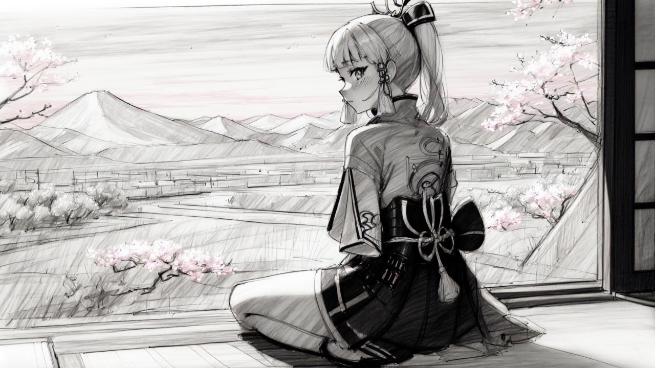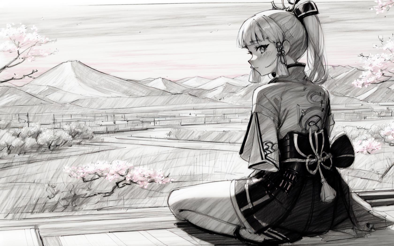 1girl, armor, bangs, blunt bangs, blush, breastplate, cherry blossoms, closed mouth, from behind, greyscale, hair ornament, hair ribbon, japanese clothes, long hair, looking at viewer, looking back, mole, mole under eye, monochrome, mountain , petals, pleated skirt, ponytail, ribbon, seiza, short sleeves, sidelocks, sitting, skirt, solo, tassel, tree, tress ribbon
