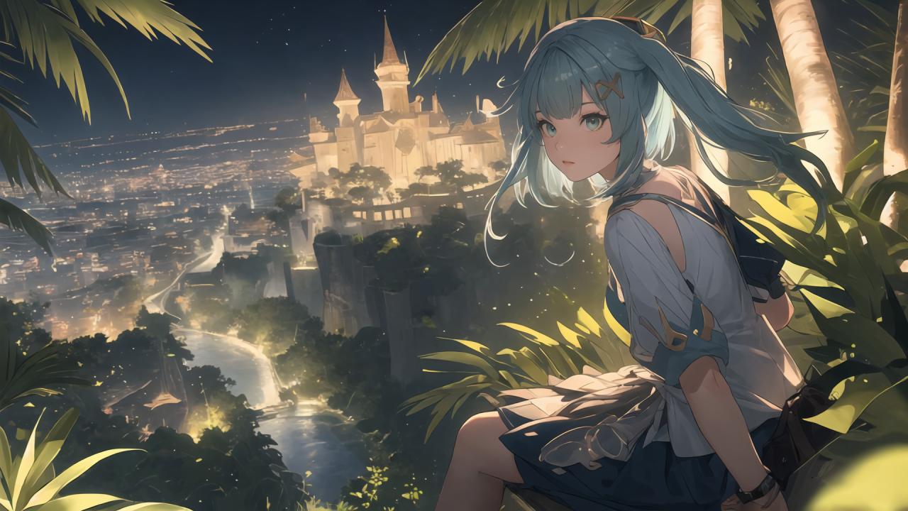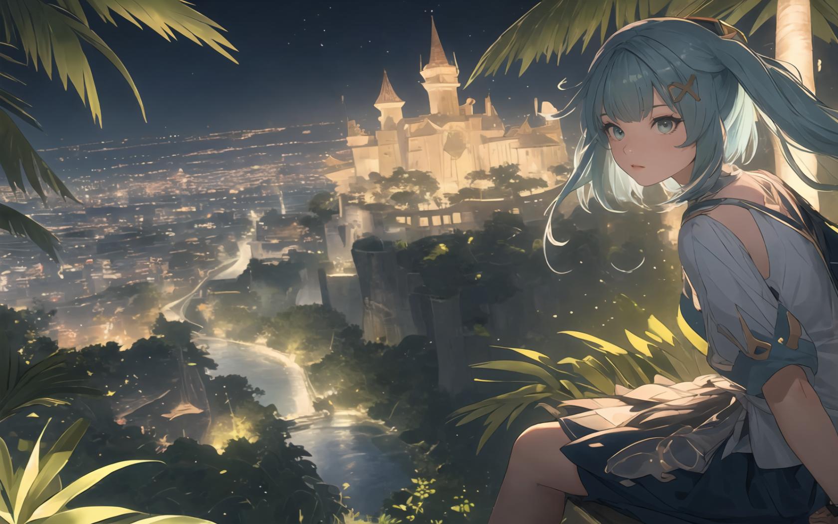 lit oriental medieval town far away, jungle below,