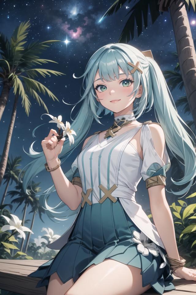 1girl, aqua eyes, aqua hair, bangle, bangs, bare shoulders, blush, bracelet, closed mouth, dress, flower, green eyes, hair ornament, holding, holding flower, jewelry, long hair, looking at viewer, neck ring , night, night sky, outdoors, palm tree, pleated skirt, puffy sleeves, short sleeves, sitting, skirt, sky, small breasts, smile, solo, star (sky), starry sky, tree, twintails, white flower, x hair ornament