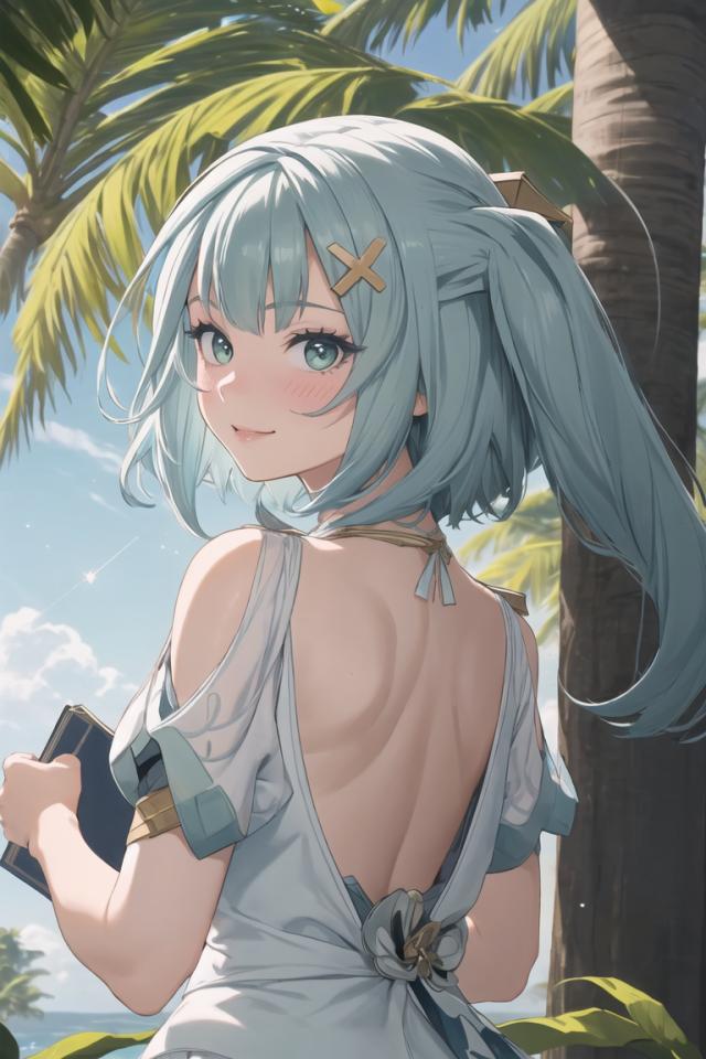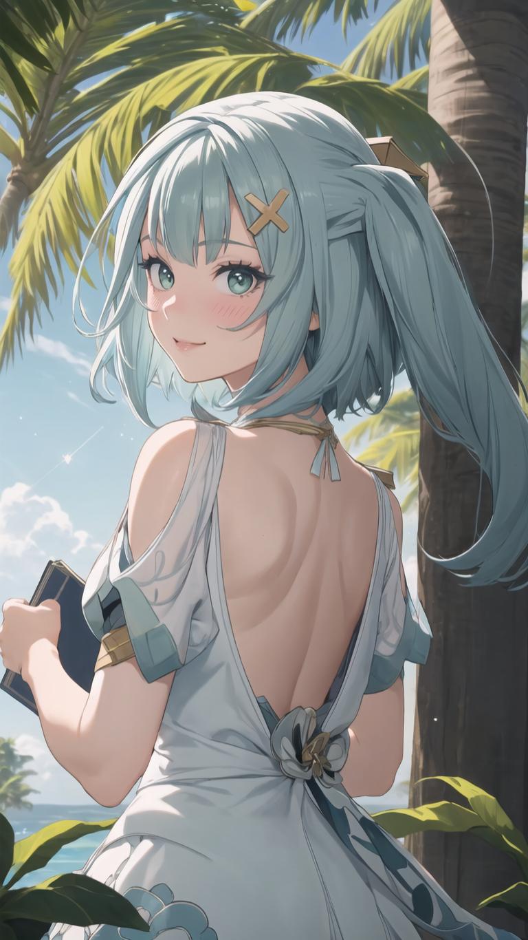 1girl, aqua eyes, aqua hair, back, back cutout, backless dress, backless outfit, bangs, bare back, bare shoulders, blush, book, closed mouth, clothing cutout, day, dress, from behind, green eyes, hair ornament, holding, holding book, long hair, looking at viewer, looking back, median furrow , medium breasts, outdoors, palm tree, short sleeves, shoulder blades, shoulder cutout, sky, smile, solo, tree, twintails, white dress, x hair ornament