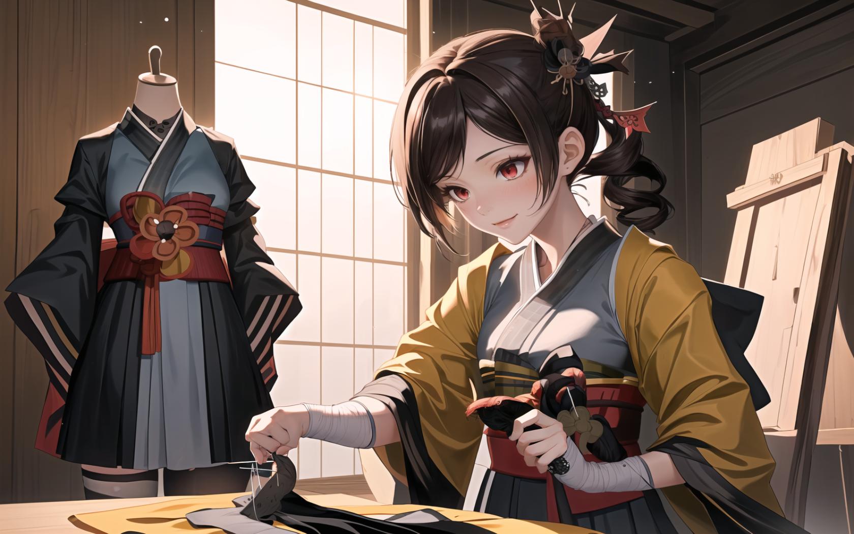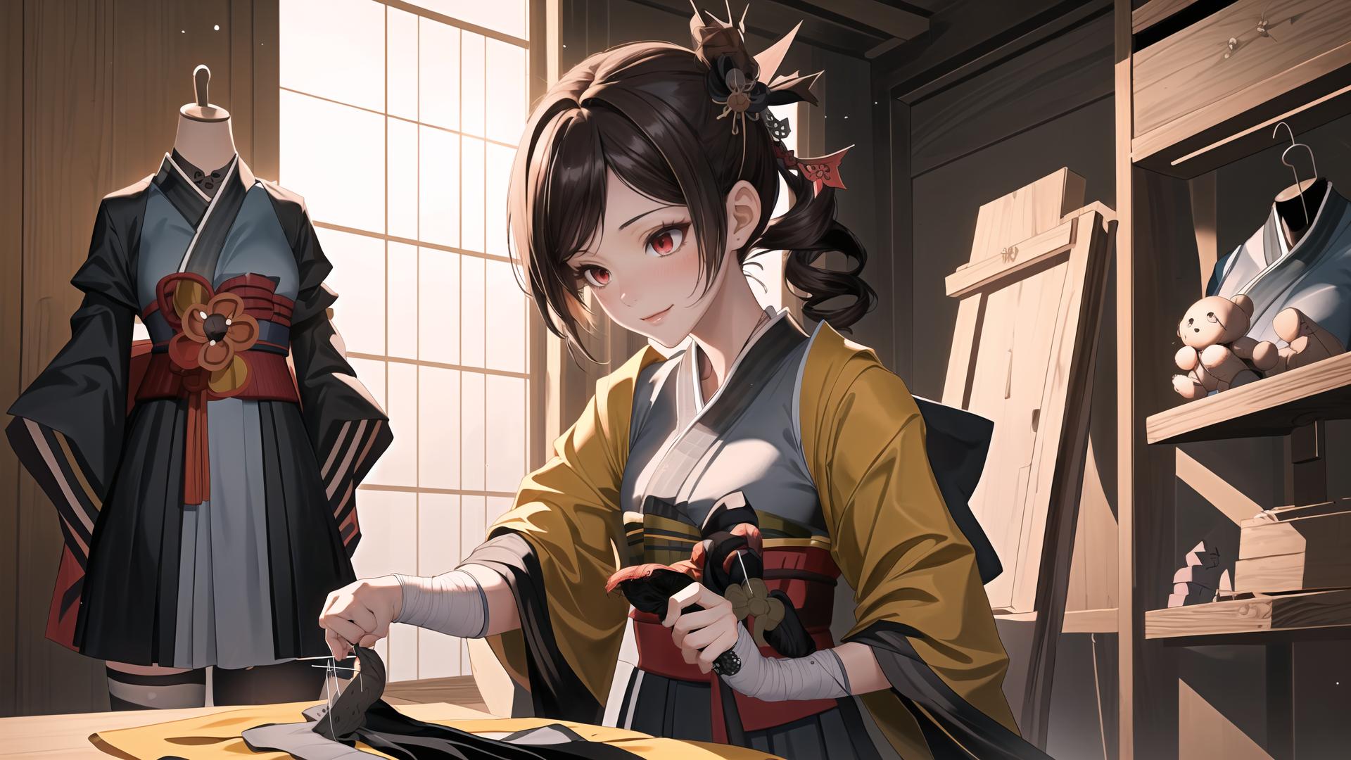 1girl,close view,((((sewing a stuffed puppet, medieval japanese sewing workshop)))),