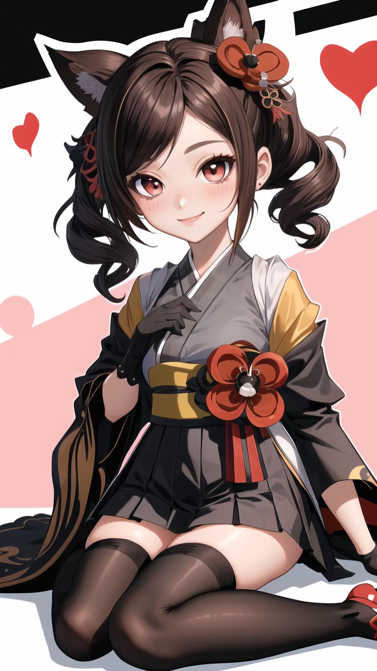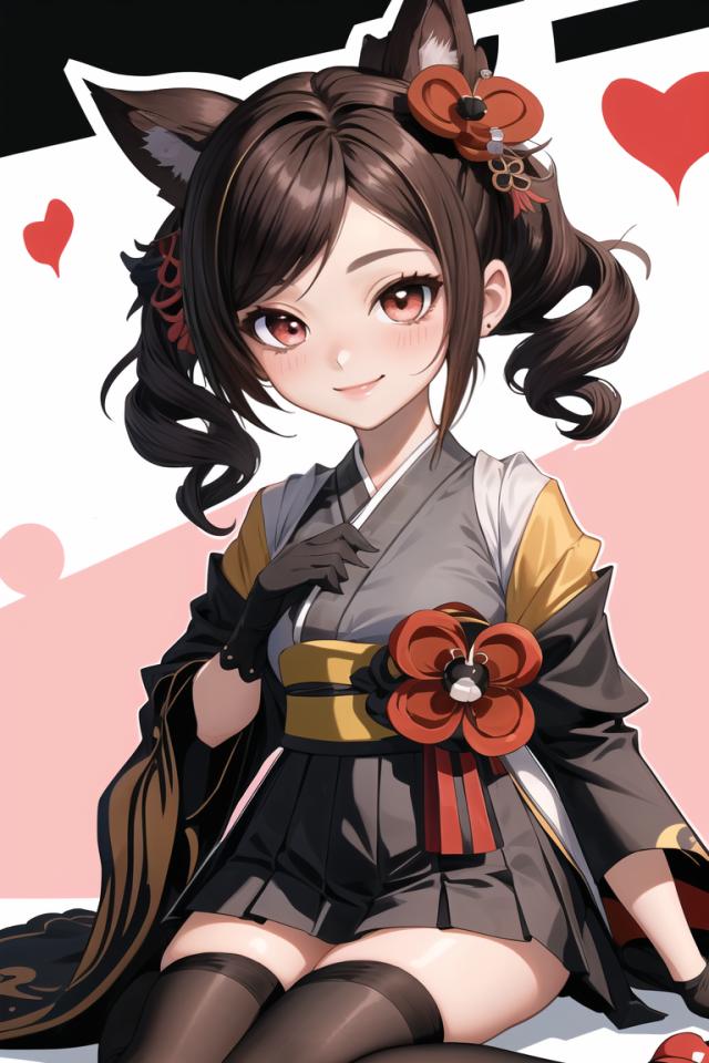 1girl, animal ear fluff, animal ears, bangs, black gloves, black hair, black skirt, black thighhighs, blush, brown hair, closed mouth, extra ears , gloves, hair ornament, hakama, heart, japanese clothes, kimono, long sleeves, looking at viewer, obi, pleated skirt, red eyes, sash, shoes, sidelocks, sitting, skirt, smile, solo, swept bangs, thighhighs, twintails, wariza, wide sleeves, zettai ryouiki