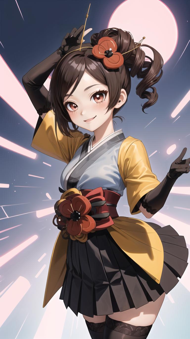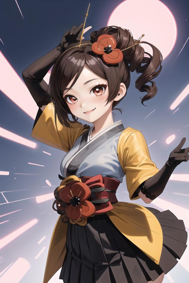 Prompt <lora:chiori:0.8> chiori, 1girl, brown hair, drill hair, hair ornament,hair flower, flower, red eyes, elbow gloves,short sleeves,wide sleeves, japanese clothes, kimono, pleated skirt,dress, black thighhighs, close view,((cute,kawai,happy,smiling)),(dynamic pose:1.6), heart-shaped pupils,big anime eyes, blush,Speed lines,