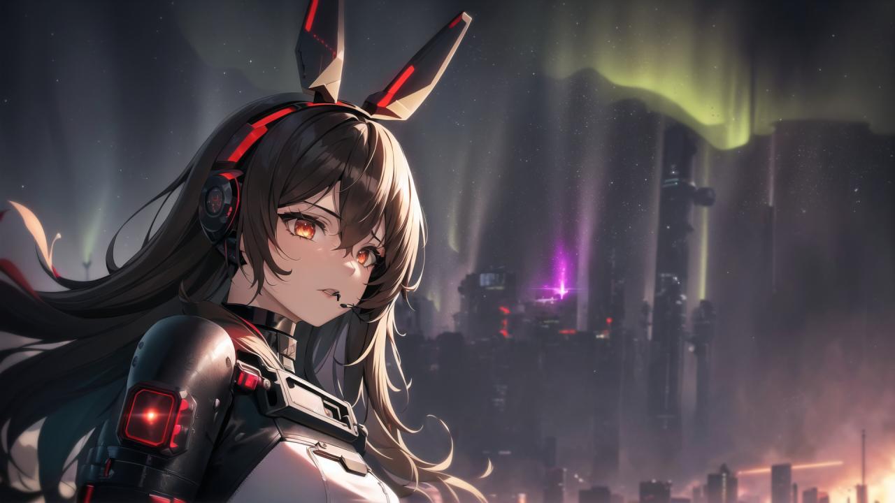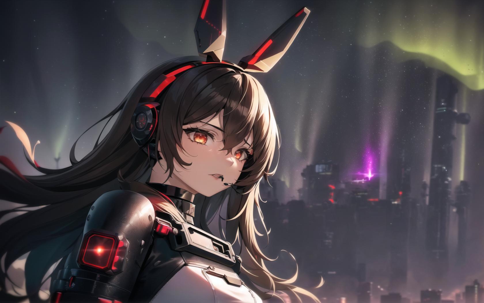 | Prompt | (detailed:1.5), (apocalyptic art,cyberpunk, dark fantasy art:1.4), (perfect artwork), best quality,,(8k), (4k),(Masterpiece), (Best Quality), extremely detailed, intricate, hyper detailed, illustration,soft lighting,learly worked out detail, intricate, cinematic,(depth of field),( dramatic lighting:1.2), <lora:amber1:1>,amberrnd,1girl, (red hairband, bunny ears), (long brown hair), (solo), (cybernetic earpiece,black leather cape,black cybernetic leather armor:1.4), cyberpunk futuristic town, black sky, dark clouds, rain,wind, futuristic cyperpunk spaceship in the sky, (galaxy background, aurora borealis:1.4), baron bunny (genshin impact), angry, serious, ((sexy)), ((dramatic angle, dynamic pose)), face focus, (holding laser weapon:1.2), |