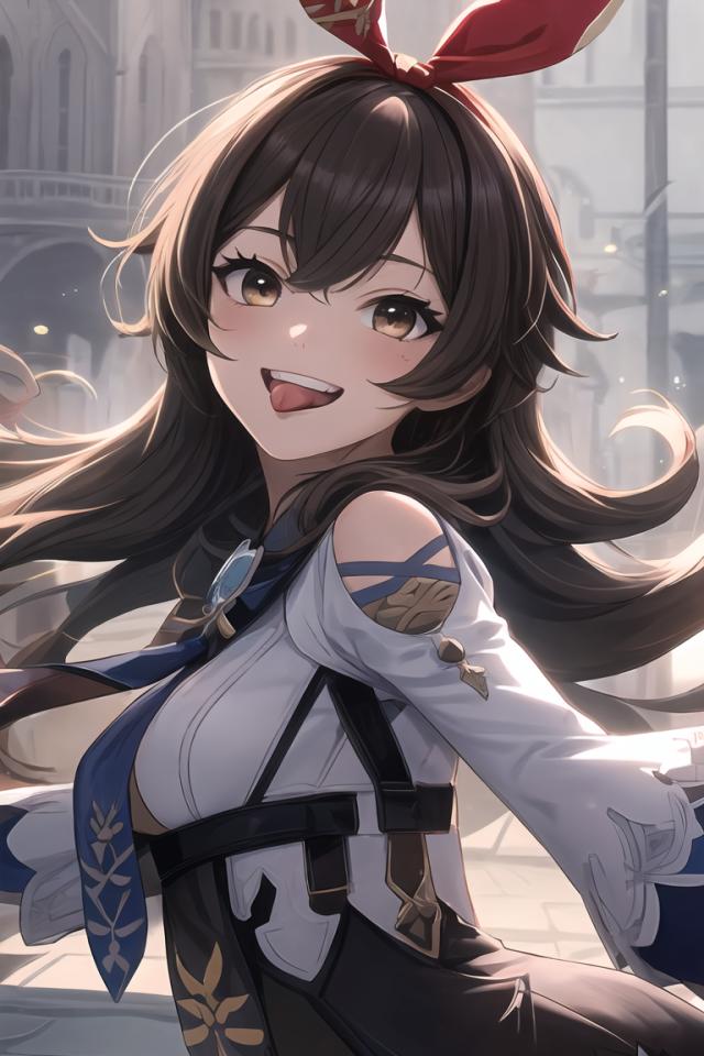 <lora:amber1:0.95>, 1girl, amberdef, brown hair, grin, v, hair ribbon,