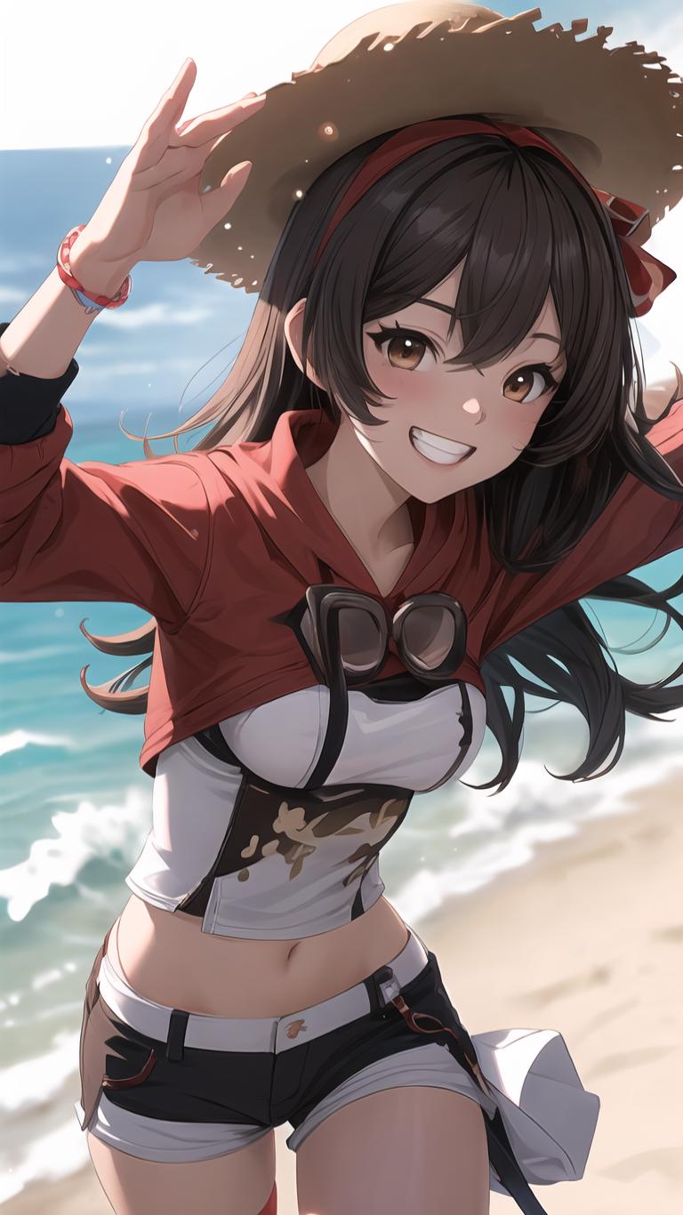 1girl, arms up, bangs, beach, belt, black hair, black shorts, blush, bracelet, brown eyes, brown hair, brown headwear, cowboy shot, crop top, day, goggles, goggles around neck, grin, hair between eyes, hairband, hand on headwear, hands on headwear , hat, jacket, jewelry, long hair, long sleeves, looking at viewer, medium breasts, midriff, navel, ocean, outdoors, red hairband, shirt, short shorts, shorts, smile, solo, stomach, straw hat, water