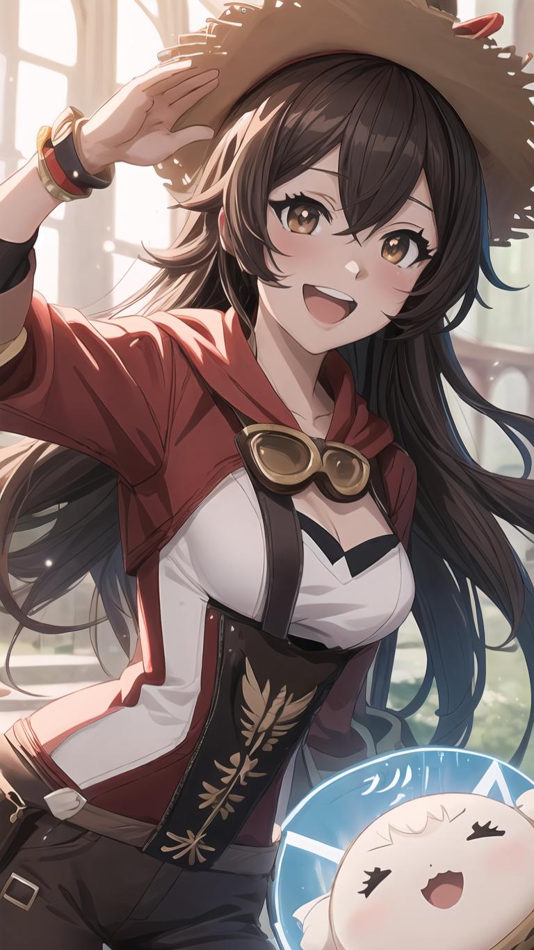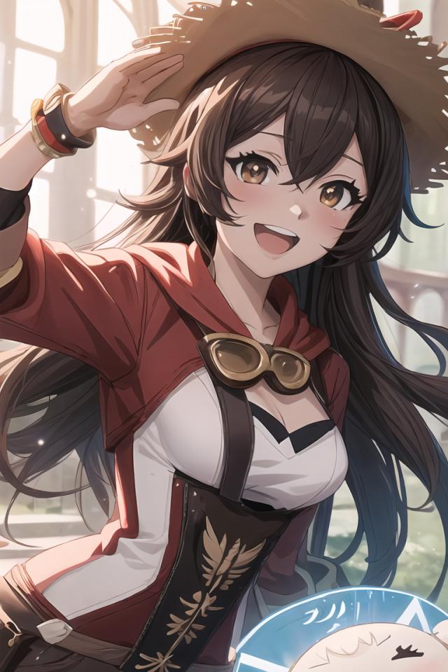 1girl, :d, bangs, blush, bracelet, brown eyes, brown hair, brown headwear, brown shorts, cleavage, cowboy shot, crossed bangs, goggles, goggles around neck , hair between eyes, hat, jacket, long hair, long sleeves, looking at viewer, medium breasts, open mouth, red jacket, red ribbon, ribbon, short shorts, shorts, shrug (clothing), smile, solo, straw hat