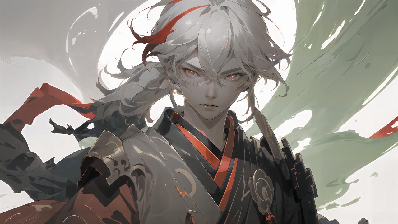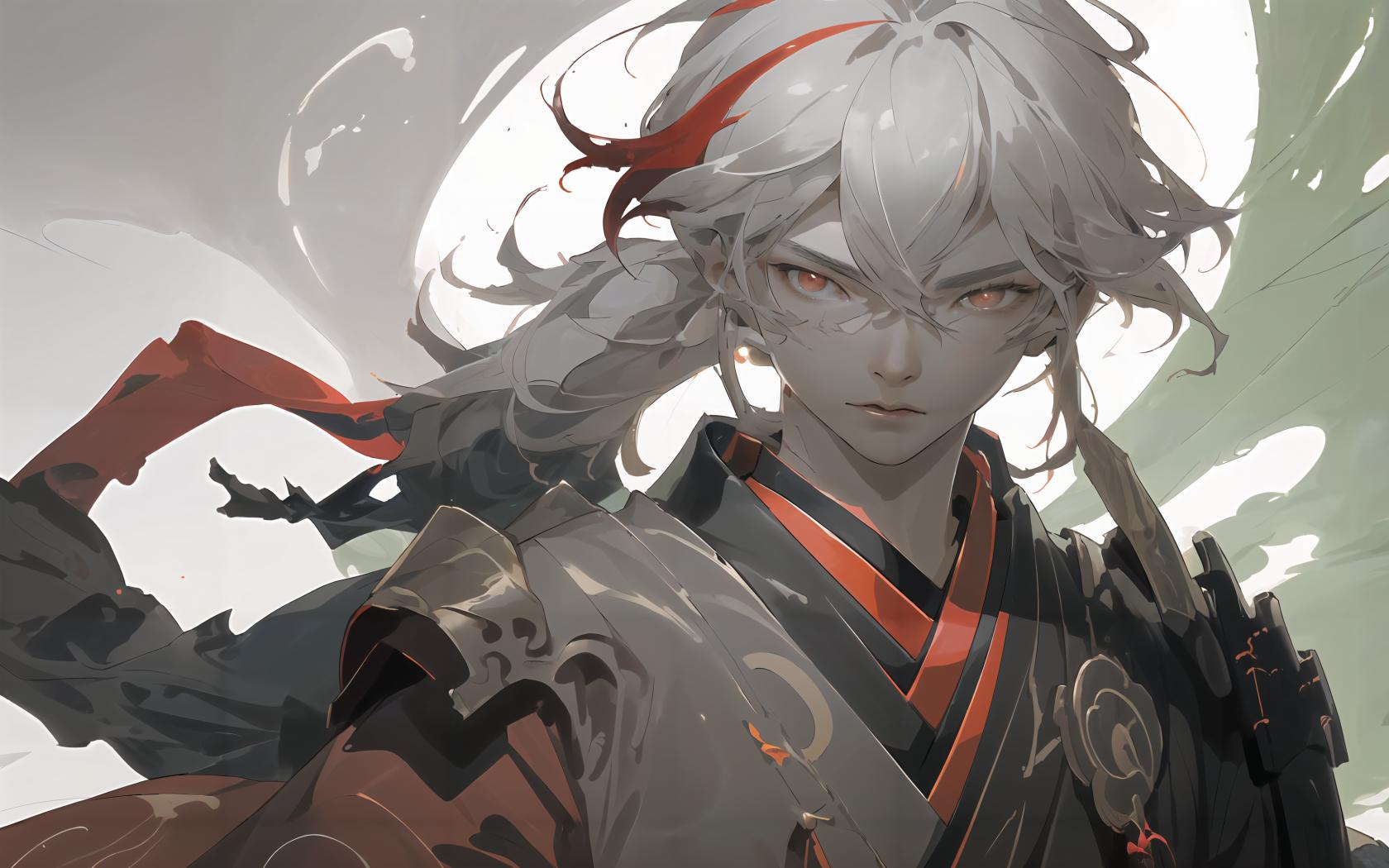 (red eyes), bangs, multicolored hair, japanese clothes, streaked hair, red hair, hair between eyes, japanese armor, white hair,ponytail