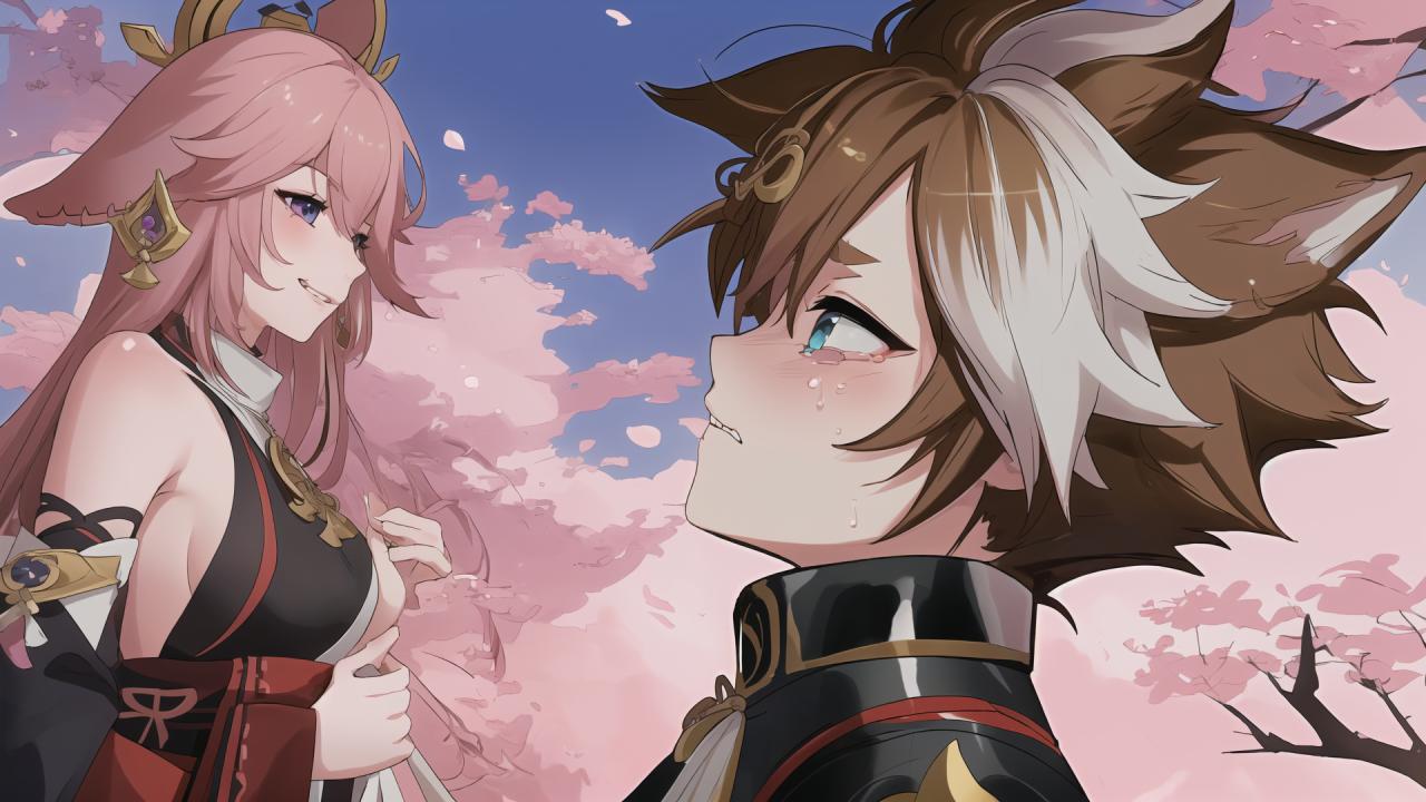 | Prompt | ((1girl, 1boy,side view)), ADDCOMM (sakura petals in the wind), standing still front of a medieval japanese temple, top of the world, medieval japanese town below, sakura blossoms, ADDBASE <lora:yaemiko1-000008:0.9> 1girl,yaemikodef,tall, playful, grin, v,fox ears, ADDCOL <lora:gorou:0.7>1boy,gorou (genshin impact), ((little boy)), animal ears, solo, multicolored hair, brown hair, dog boy,((afraid,chibi, crying)), |