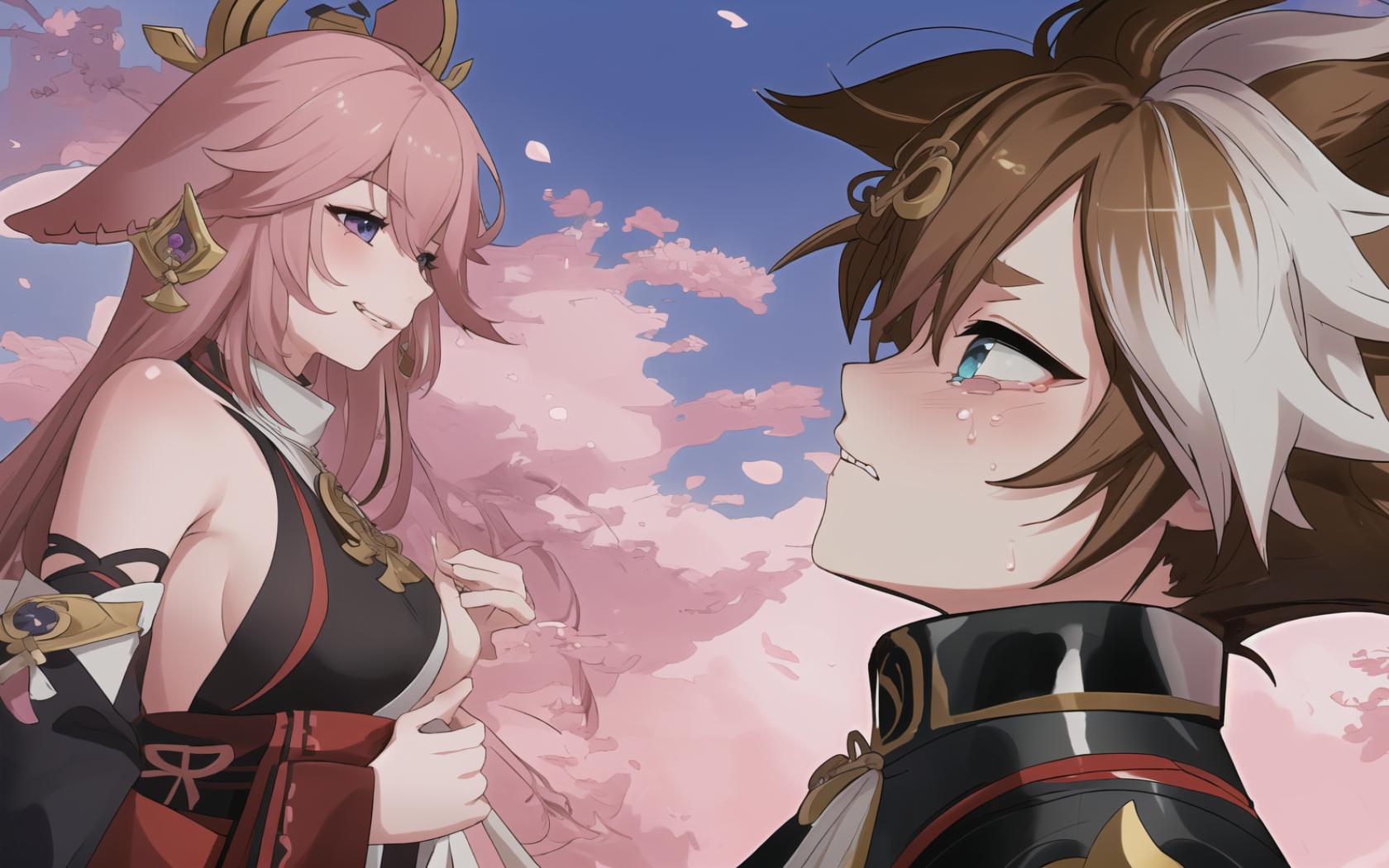 1boy, 1girl, animal ears, armor, bangs, bare shoulders, blue eyes, blush, brown hair, cherry blossoms, detached sleeves, dog ears, earrings, eye contact, fox ears, hair between eyes, hair ornament, hetero, japanese armor , japanese clothes, jewelry, long hair, looking at another, multicolored hair, nontraditional miko, outdoors, parted lips, petals, pink hair, purple eyes, sideboob, smile, streaked hair, tears, tree, upper body, white hair
