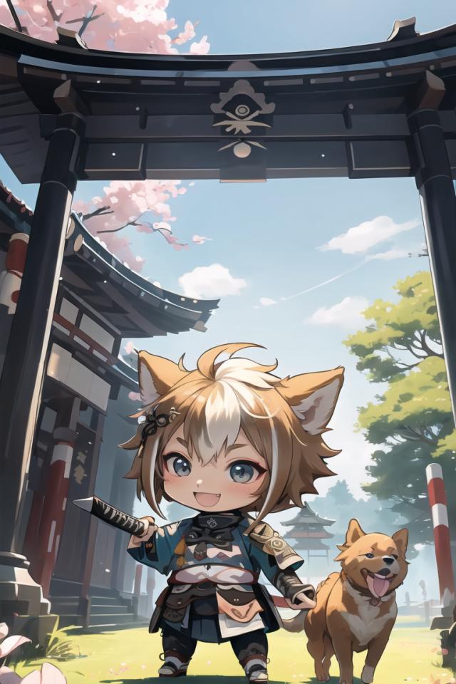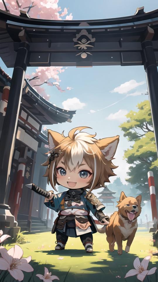 1boy, :d, ahoge, animal ears, architecture, armor, bangs, blue eyes, blue sky, blush, brown hair, cherry blossoms, chibi, cloud, day, dog, dog boy , dog ears, dog tail, east asian architecture, fang, flower, hair between eyes, hair ornament, holding, holding weapon, japanese armor, japanese clothes, looking at viewer, male focus, multicolored hair, open mouth, outdoors, paw print, sky, smile, solo, standing, streaked hair, sword, tail, tassel, tree, weapon, white flower, white hair