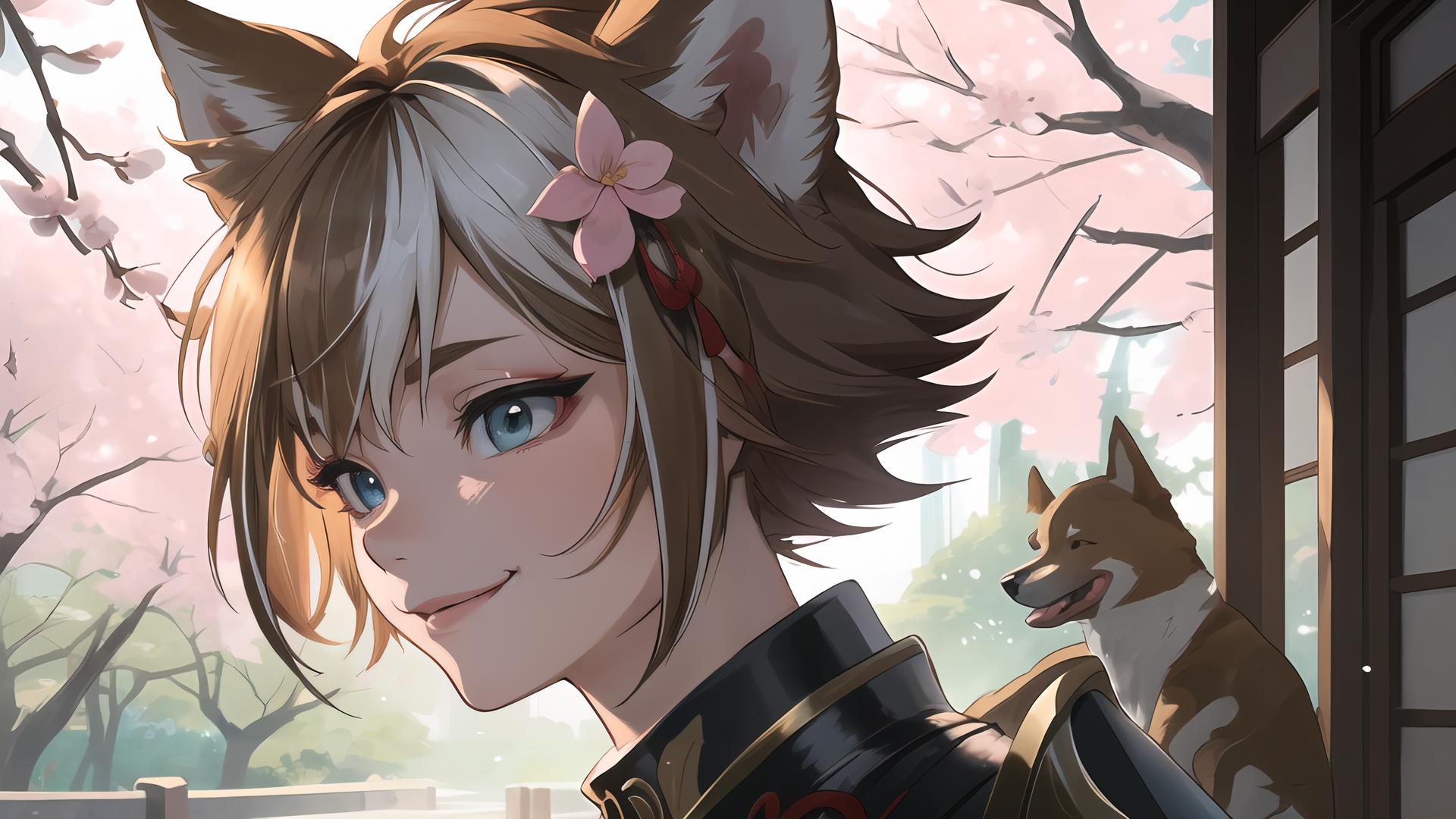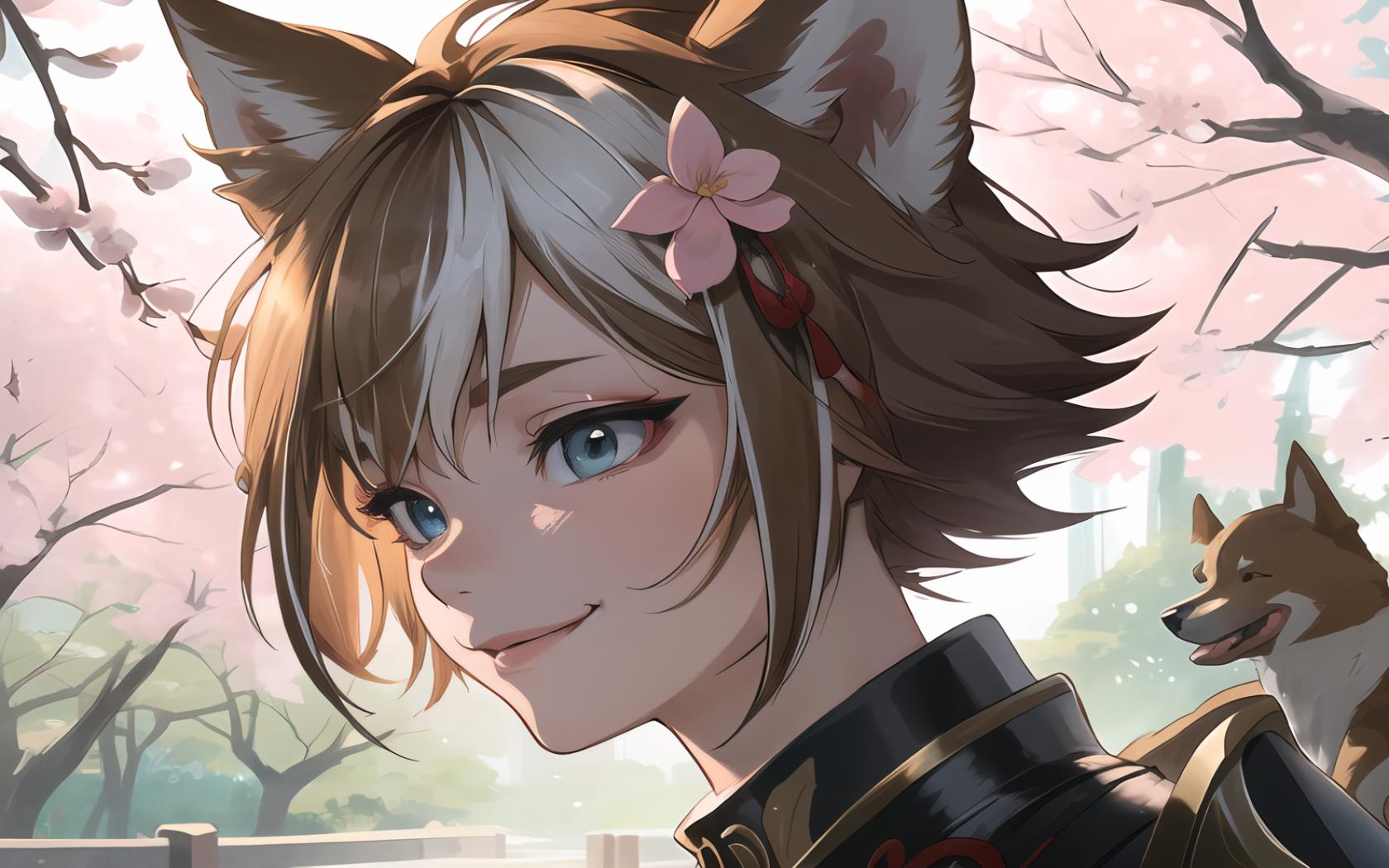 1boy, animal, animal ears, armor, bangs, blue eyes, branch, brown hair, cherry blossoms, dog, dog boy, dog ears, eyeshadow, flower, hair flower, hair ornament, japanese armor, japanese clothes, makeup, male focus, multicolored hair, outdoors, petals, pink flower, portrait, shiba inu , short hair, smile, solo, streaked hair, tree, white hair