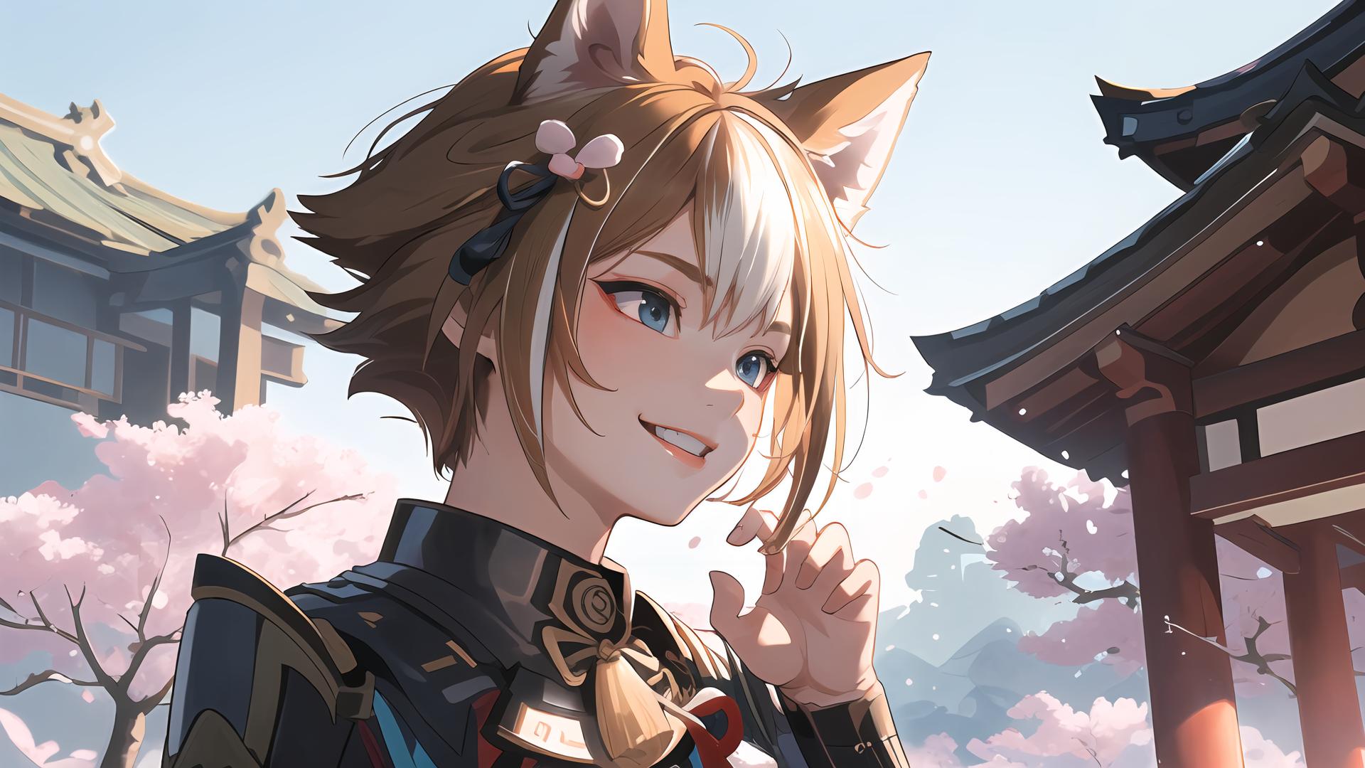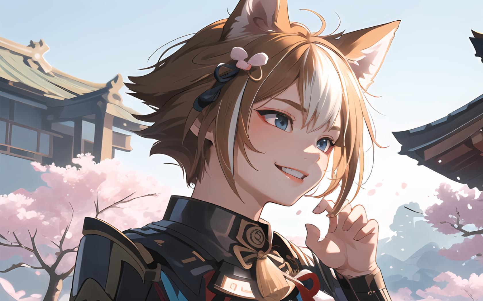 1boy, animal ears, architecture, armor, bangs, blue eyes, brown hair, cherry blossoms, day, dog ears, east asian architecture , grin, hair ornament, hand up, japanese armor, japanese clothes, male focus, multicolored hair, outdoors, petals, short hair, sky, smile, solo, streaked hair, tree, upper body, white hair
