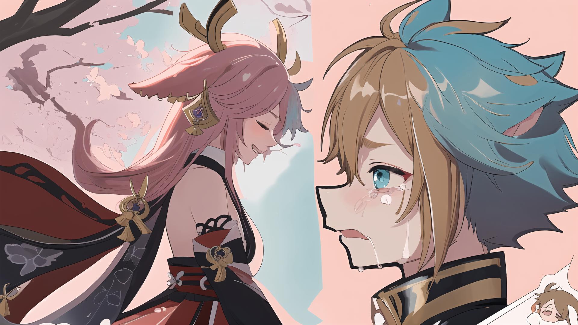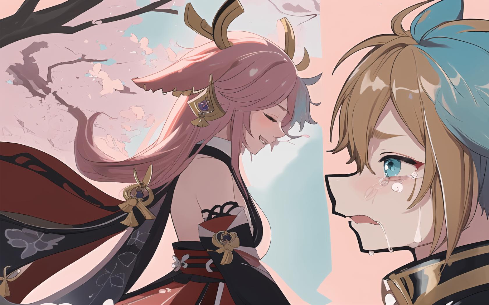 | Prompt | ((1girl, 1boy,side view)), ADDCOMM (sakura petals in the wind), standing still front of a medieval japanese temple, top of the world, medieval japanese town below, sakura blossoms, ADDBASE <lora:yaemiko1-000008:0.9> 1girl,yaemikodef,tall, playful, grin, closed eyes, v,fox ears, ADDCOL <lora:gorou:0.7>1boy,gorou (genshin impact), little boy, animal ears, solo, multicolored hair, brown hair, dog boy,(((afraid,chibi, crying))), |