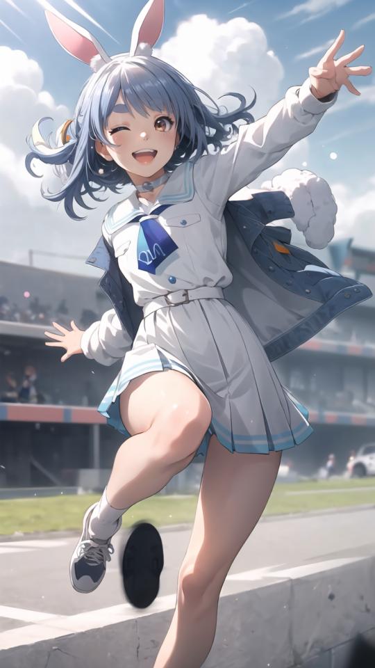 1girl, ;d, animal ears, bangs, belt, black footwear, blue hair, blue jacket, blue neckerchief, blue sky, blush, brown eyes, carrot hair ornament , choker, cloud, day, food-themed hair ornament, fur-trimmed jacket, hair ornament, hair ribbon, jacket, long sleeves, looking at viewer, neckerchief, one eye closed, open clothes, open jacket, open mouth, outdoors, pleated skirt, rabbit ears, sailor collar, school uniform, shirt, shoes, short eyebrows, skirt, sky, smile, socks, solo, solo focus, standing, standing on one leg, thick eyebrows, upper teeth only, virtual youtuber, white belt, white choker, white hair, white sailor collar, white shirt, white skirt, white socks