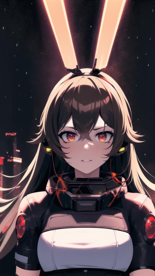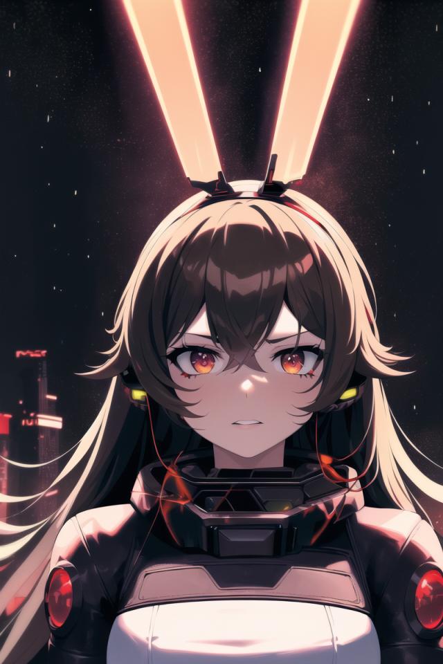 | Prompt | (detailed:1.5), (apocalyptic art,cyberpunk, dark fantasy art:1.4), (perfect artwork), best quality,,(8k), (4k),(Masterpiece), (Best Quality), extremely detailed, intricate, hyper detailed, illustration,soft lighting,learly worked out detail, intricate, cinematic,(depth of field),( dramatic lighting:1.2), <lora:amber1:1>,amberrnd,1girl, (red hairband, bunny ears), (long brown hair), (solo), (cybernetic earpiece,black leather cape,black cybernetic leather armor:1.4), cyberpunk futuristic town, black sky, dark clouds, rain,wind, futuristic cyperpunk spaceship in the sky, (galaxy background, aurora borealis:1.4), baron bunny (genshin impact), angry, serious, ((sexy)), ((dramatic angle, dynamic pose)), face focus, (holding laser weapon:1.2), |